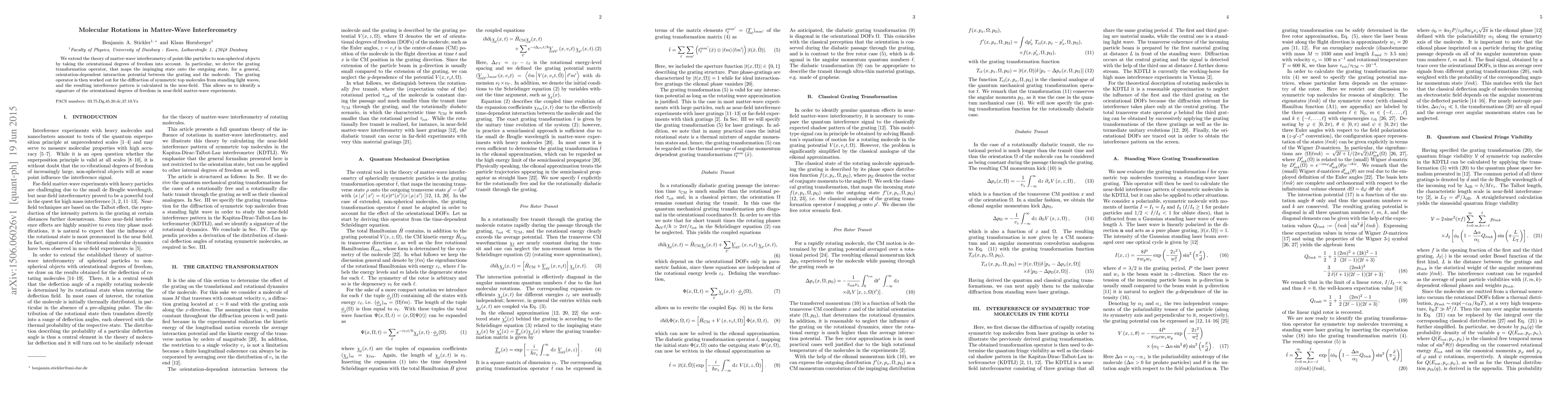 This paper extends the theory of matter-wave interferometry to non-spherical molecules by considering their orientational degrees of freedom. It derives a grating transformation operator for molecules interacting with light waves, predicting an interference pattern signature in near-field experiments.