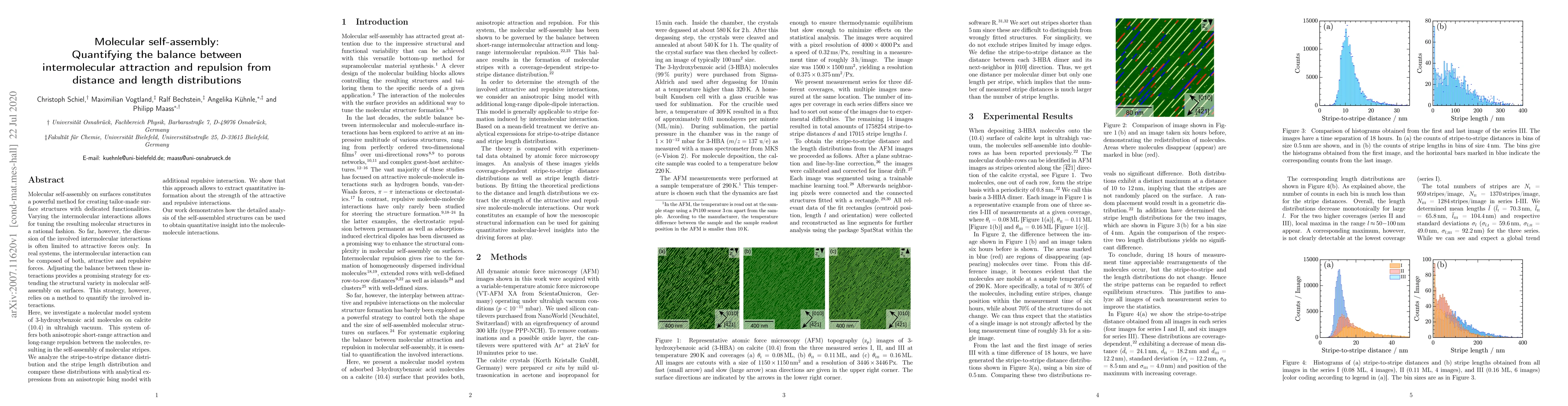 This paper investigates molecular self-assembly on surfaces using a model system of 3-hydroxybenzoic acid on calcite, focusing on the balance between attractive and repulsive intermolecular interactions. By analyzing the distance and length distributions of molecular stripes, the authors demonstrate a method to quantify these interactions, providing insights into the underlying forces governing the self-assembly process.