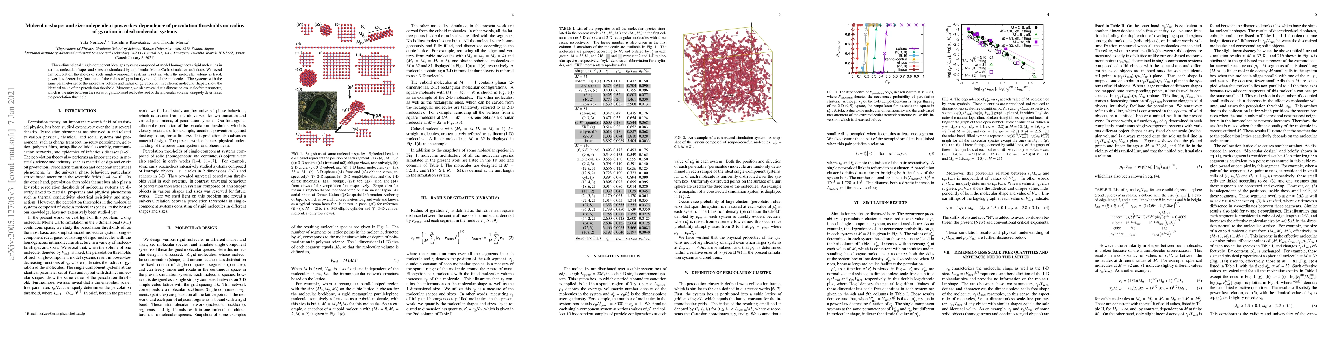 This study uses molecular simulations to show that percolation thresholds in 3D systems of ideal gas molecules depend power-lawly on the molecules' radius of gyration, regardless of shape or size, with a unique scale-free parameter determining the threshold.