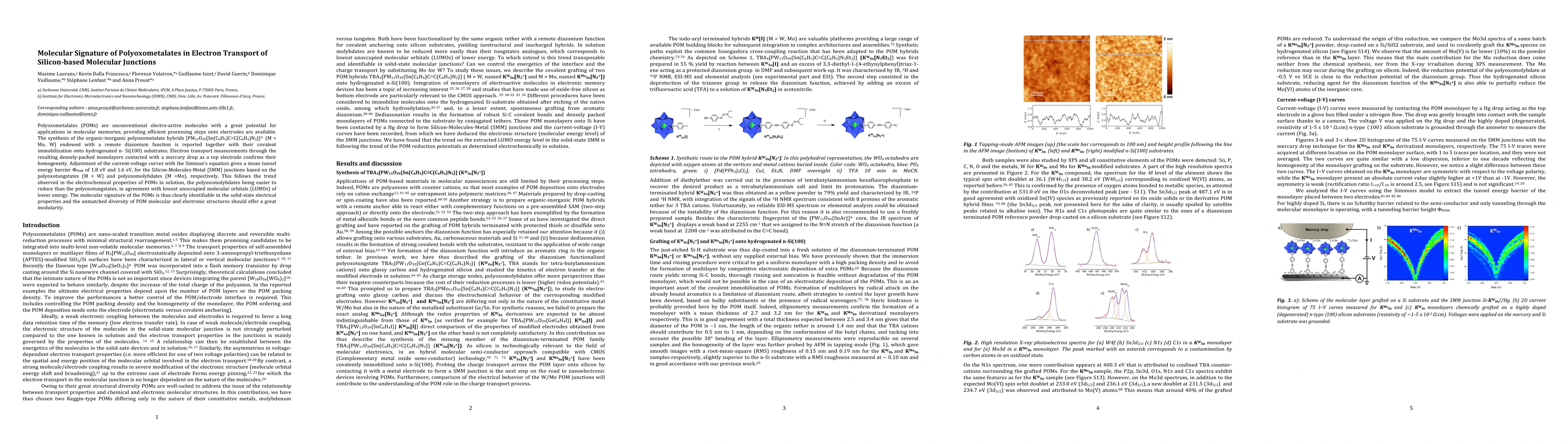 This paper reports the synthesis and covalent immobilization of polyoxometalate hybrids onto silicon substrates, demonstrating their electron transport properties in molecular junctions. The study reveals a significant molecular signature in the electrical properties, with polyoxomolybdates showing lower tunnel energy barriers compared to polyoxotungstates, aligning with their lower LUMO energies.