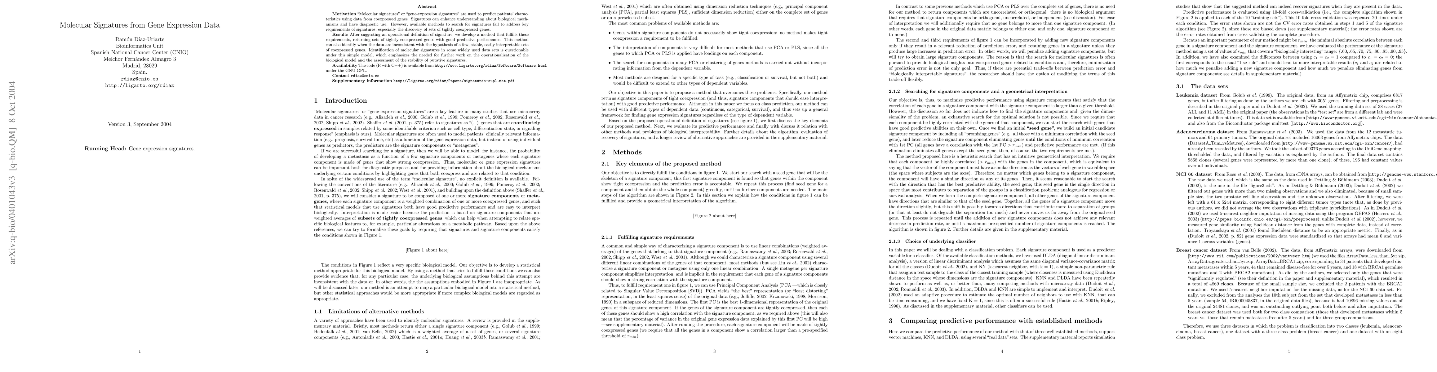 Motivation: ``Molecular signatures'' or ``gene-expression signatures'' are used to predict patients' characteristics using data from coexpressed genes. Signatures can enhance understanding about biological mechanisms and have diagnostic use. However, available methods to search for signatures fail to address key requirements of signatures, especially the discovery of sets of tightly coexpressed genes. Results: After suggesting an operational definition of signature, we develop a method that fulfills these requirements, returning sets of tightly coexpressed genes with good predictive performance. This method can also identify when the data are inconsistent with the hypothesis of a few, stable, easily interpretable sets of coexpressed genes. Identification of molecular signatures in some widely used data sets is questionable under this simple model, which emphasizes the needed for further work on the operationalization of the biological model and the assessment of the stability of putative signatures. Availability: The code (R with C++) is available from http://www.ligarto.org/rdiaz/Software/Software.html under the GNU GPL.