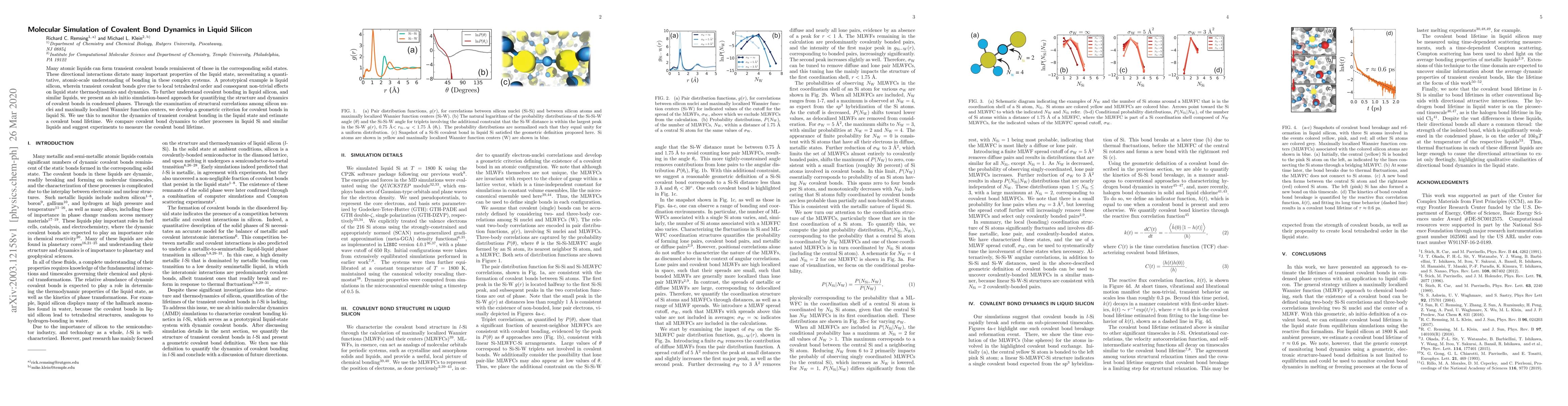 Many atomic liquids can form transient covalent bonds reminiscent of those in the corresponding solid states. These directional interactions dictate many important properties of the liquid state, necessitating a quantitative, atomic-scale understanding of bonding in these complex systems. A prototypical example is liquid silicon, wherein transient covalent bonds give rise to local tetrahedral order and consequent non-trivial effects on liquid state thermodynamics and dynamics. To further understand covalent bonding in liquid silicon, and similar liquids, we present an ab initio simulation-based approach for quantifying the structure and dynamics of covalent bonds in condensed phases. Through the examination of structural correlations among silicon nuclei and maximally localized Wannier function centers, we develop a geometric criterion for covalent bonds in liquid Si. We use this to monitor the dynamics of transient covalent bonding in the liquid state and estimate a covalent bond lifetime. We compare covalent bond dynamics to other processes in liquid Si and similar liquids and suggest experiments to measure the covalent bond lifetime.