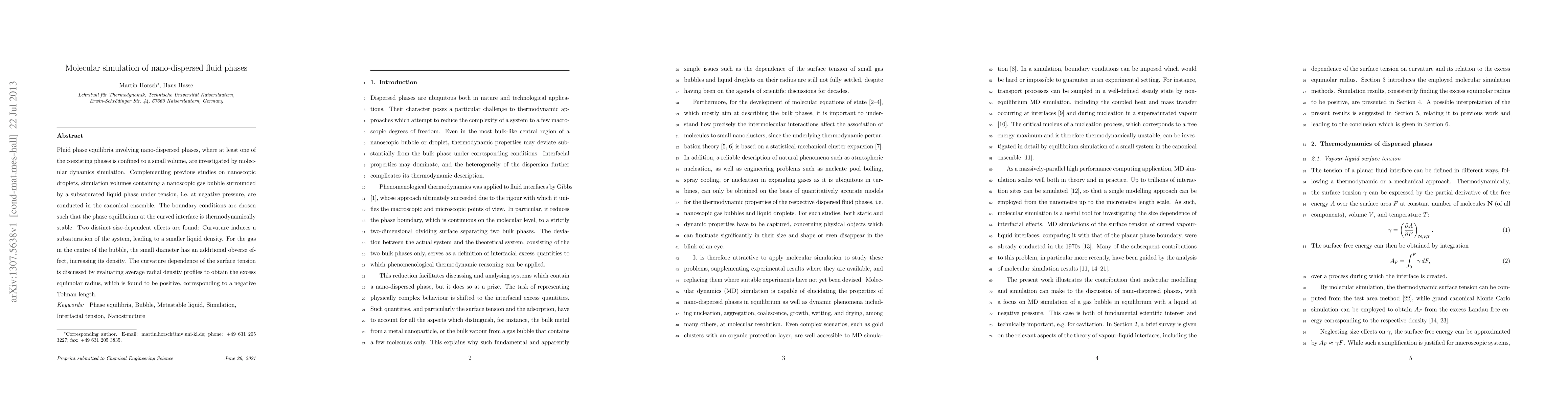 This paper investigates fluid phase equilibria in nano-dispersed phases using molecular dynamics simulations, focusing on a nanoscopic gas bubble in a subsaturated liquid phase under tension. The study reveals size-dependent effects, including curvature-induced subsaturation and density increase in the gas bubble due to its small diameter.