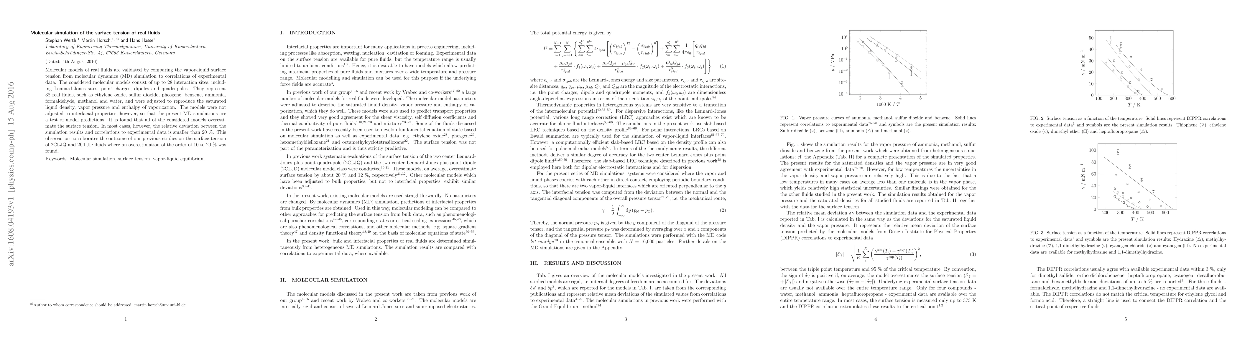 This paper validates molecular models of real fluids by comparing simulated vapor-liquid surface tension from molecular dynamics to experimental data correlations. Despite overestimations, the models show relative deviations of less than 20% from experimental values, supporting previous findings on similar fluid systems.