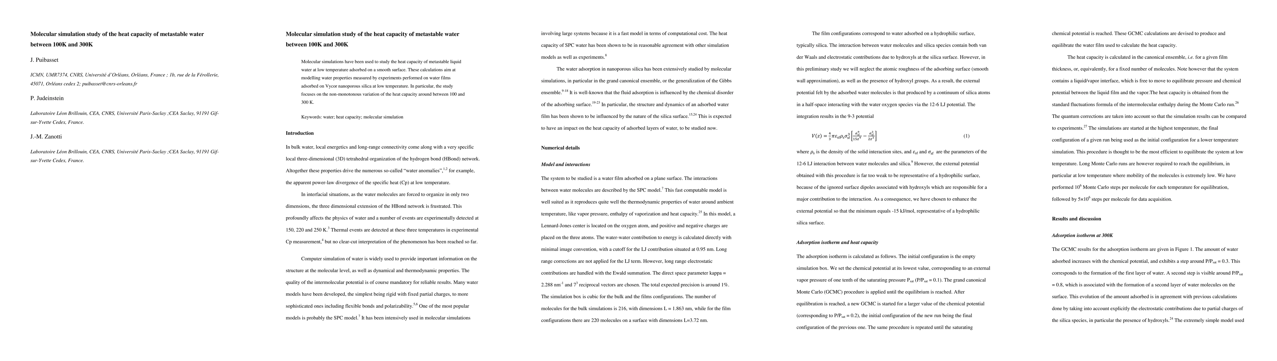 Molecular simulation study of the heat capacity of metastable water between 100K and 300K Molecular simulations have been used to study the heat capacity of metastable liquid water at low temperature adsorbed on a smooth surface. These calculations aim at modelling water properties measured by experiments performed on water films adsorbed on Vycor nanoporous silica at low temperature. In particular, the study focuses on the non-monotonous variation of the heat capacity around between 100 and 300 K.