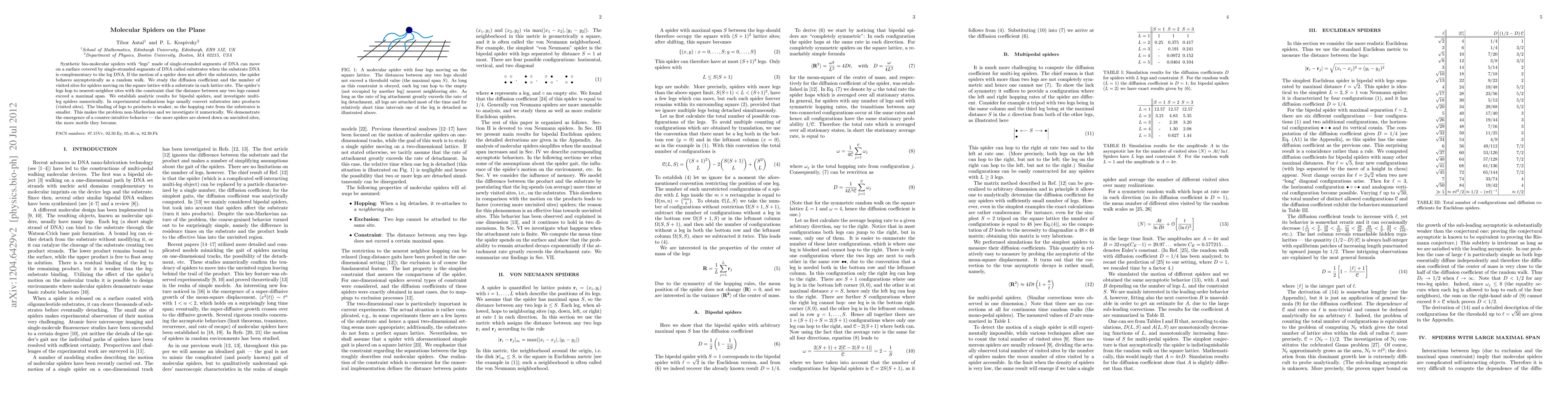 Synthetic bio-molecular spiders with "legs" made of single-stranded segments of DNA can move on a surface covered by single-stranded segments of DNA called substrates when the substrate DNA is complementary to the leg DNA. If the motion of a spider does not affect the substrates, the spider behaves asymptotically as a random walk. We study the diffusion coefficient and the number of visited sites for spiders moving on the square lattice with a substrate in each lattice site. The spider's legs hop to nearest-neighbor sites with the constraint that the distance between any two legs cannot exceed a maximal span. We establish analytic results for bipedal spiders, and investigate multileg spiders numerically. In experimental realizations legs usually convert substrates into products (visited sites). The binding of legs to products is weaker, so the hopping rate from the substrates is smaller. This makes the problem non-Markovian and we investigate it numerically. We demonstrate the emergence of a counter-intuitive behavior - the more spiders are slowed down on unvisited sites, the more motile they become.