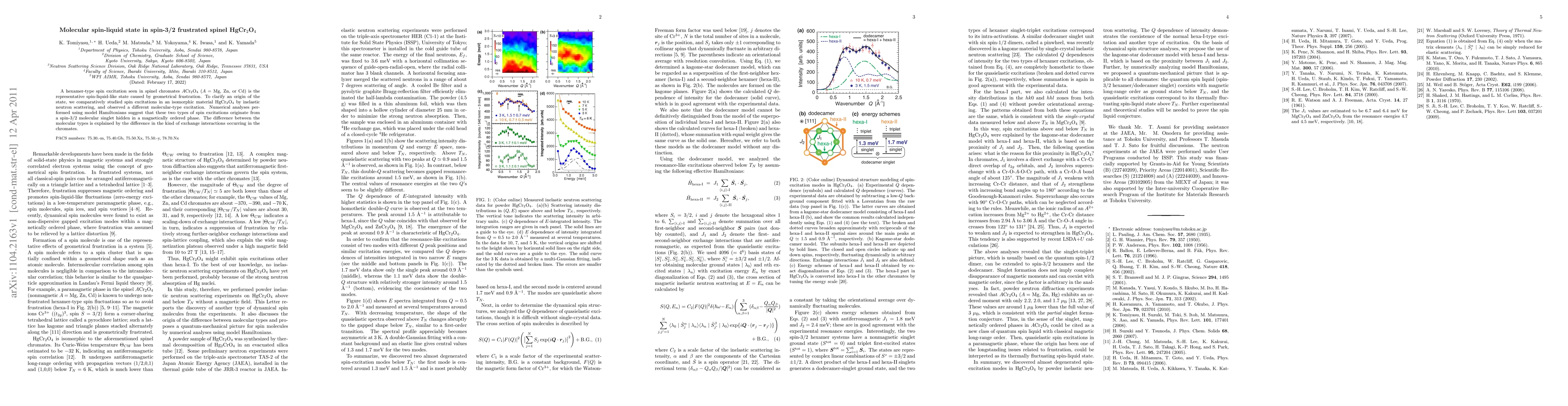 A hexamer-type spin excitation seen in spinel chromates $A$Cr$_2$O$_4$ ($A$ = Mg, Zn, or Cd) is the representative spin-liquid-like state caused by geometrical frustration. To clarify an origin of the state, we comparatively studied spin excitations in an isomorphic material HgCr$_2$O$_4$ by inelastic neutron scattering, and observed a different molecular-type excitation. Numerical analyses performed using model Hamiltonians suggest that these two types of spin excitations originate from a spin-3/2 molecular singlet hidden in a magnetically ordered phase. The difference between the molecular types is explained by the difference in the kind of exchange interactions occurring in the chromates.