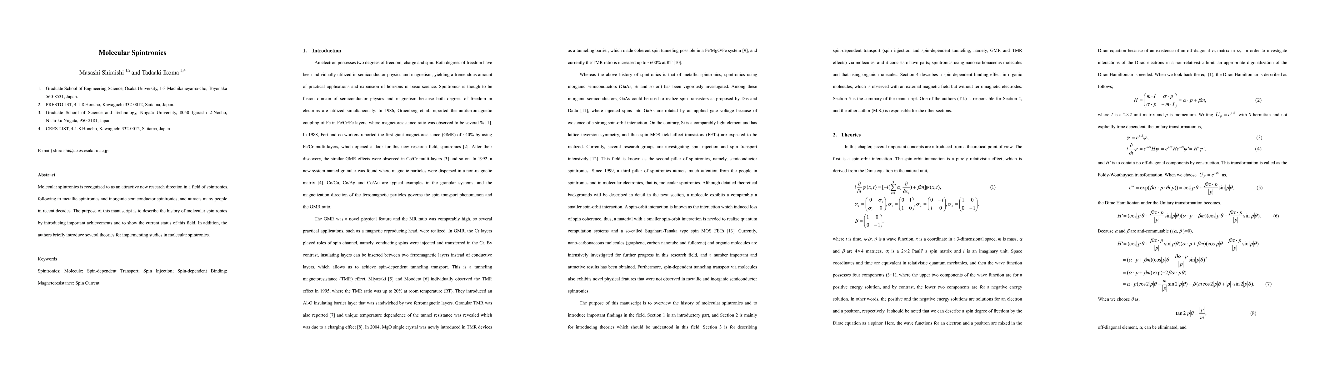 Molecular spintronics is recognized to as an attractive new research direction in a field of spintronics, following to metallic spintronics and inorganic semiconductor spintronics, and attracts many people in recent decades. The purpose of this manuscript is to describe the history of molecular spintronics by introducing important achievements and to show the current status of this field. In addition, the authors briefly introduce several theories for implementing studies in molecular spintronics.