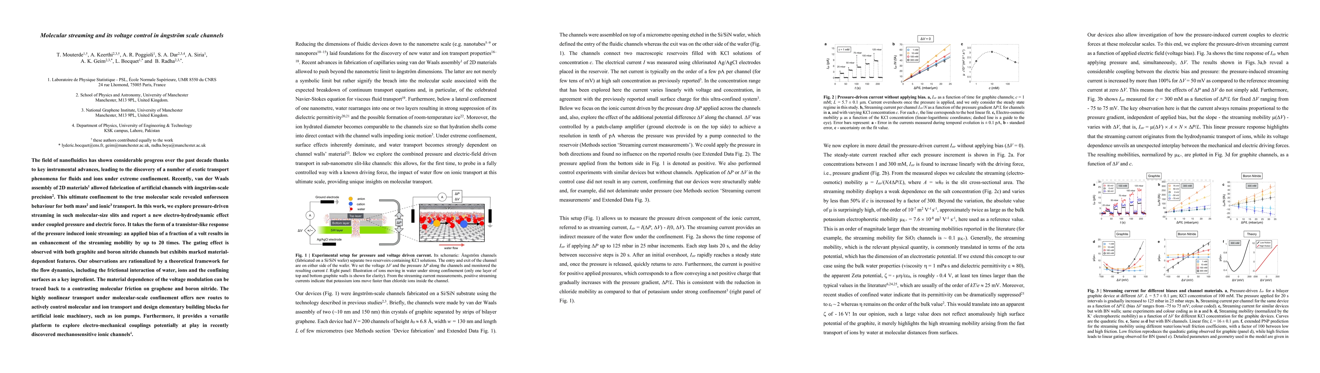 The research utilized van der Waals assembly of 2D materials to fabricate artificial channels at the Ångström scale, enabling exploration of pressure-driven streaming and a novel electro-hydrodynamic effect under coupled pressure and electric force.