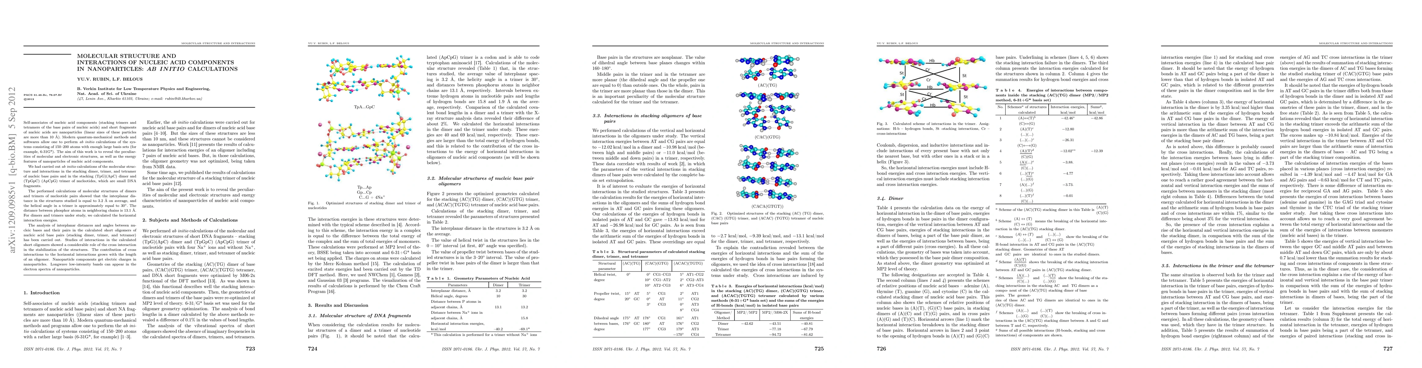 Self-associates of nucleic acid components (stacking trimers and tetramers of the base pairs of nucleic acids) and short fragments of nucleic acids are nanoparticles (linear sizes of these particles are more than 10 A. Modern quantum-mechanical methods and softwares allow one to perform ab initio calculations of the systems consisting of 150-200 atoms with enough large basis sets (for example, 6-31G*). The aim of this work is to reveal the peculiarities of molecular and electronic structures, as well as the energy features of nanoparticles of nucleic acid components.