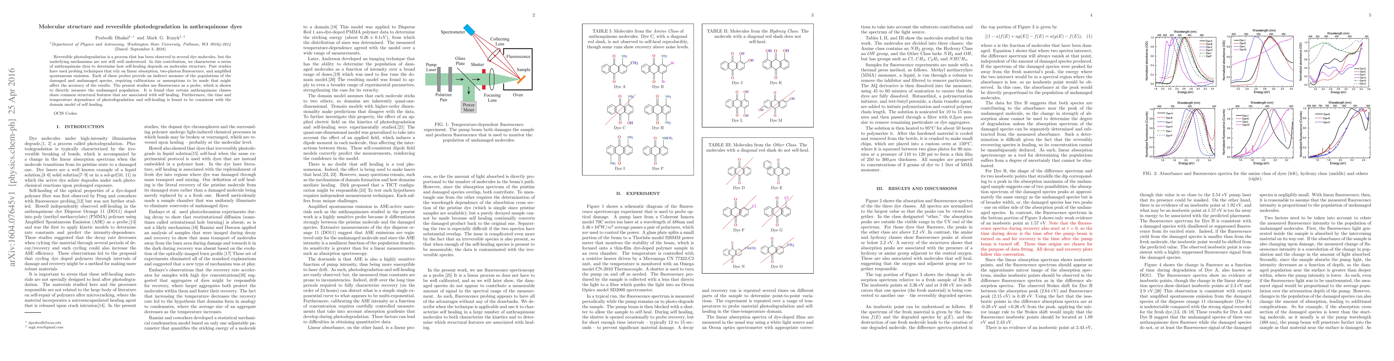 This paper investigates the reversible photodegradation mechanisms in anthraquinone dyes, focusing on how molecular structure influences self-healing. Using fluorescence as a direct probe, it identifies structural features in certain anthraquinone classes linked to self-healing, and confirms the time and temperature dependence aligns with the domain model of self-healing.