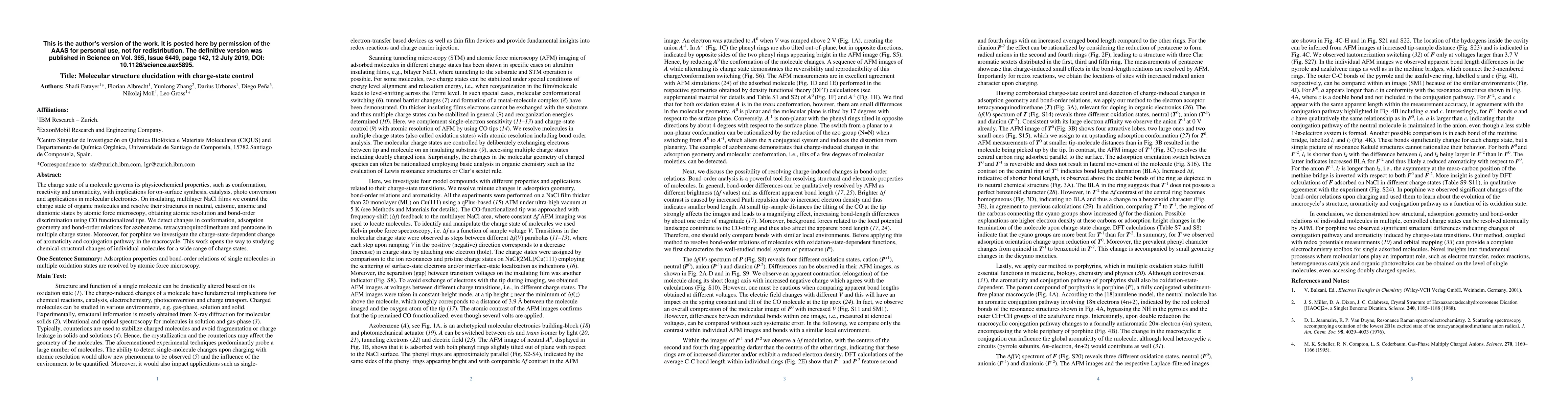 This paper investigates the molecular structure changes of organic molecules in various charge states (neutral, cationic, anionic, and dianionic) on NaCl films using atomic force microscopy. It reveals conformational, geometric, and bond-order variations in molecules like azobenzene and porphine, highlighting the impact of charge state on molecular properties and potential applications in molecular electronics.