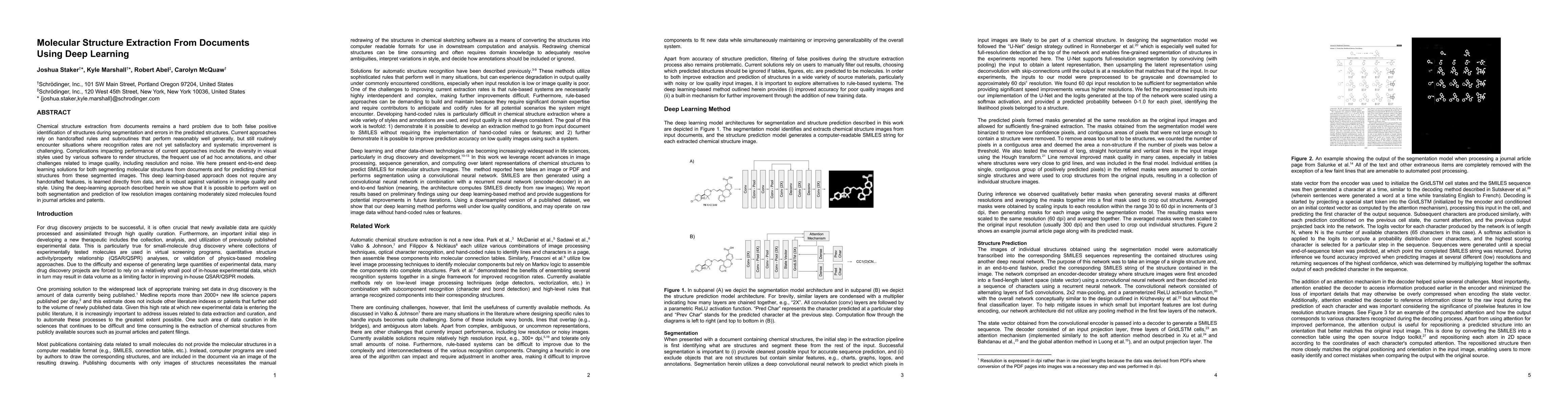 Chemical structure extraction from documents remains a hard problem due to both false positive identification of structures during segmentation and errors in the predicted structures. Current approaches rely on handcrafted rules and subroutines that perform reasonably well generally, but still routinely encounter situations where recognition rates are not yet satisfactory and systematic improvement is challenging. Complications impacting performance of current approaches include the diversity in visual styles used by various software to render structures, the frequent use of ad hoc annotations, and other challenges related to image quality, including resolution and noise. We here present end-to-end deep learning solutions for both segmenting molecular structures from documents and for predicting chemical structures from these segmented images. This deep learning-based approach does not require any handcrafted features, is learned directly from data, and is robust against variations in image quality and style. Using the deep-learning approach described herein we show that it is possible to perform well on both segmentation and prediction of low resolution images containing moderately sized molecules found in journal articles and patents.