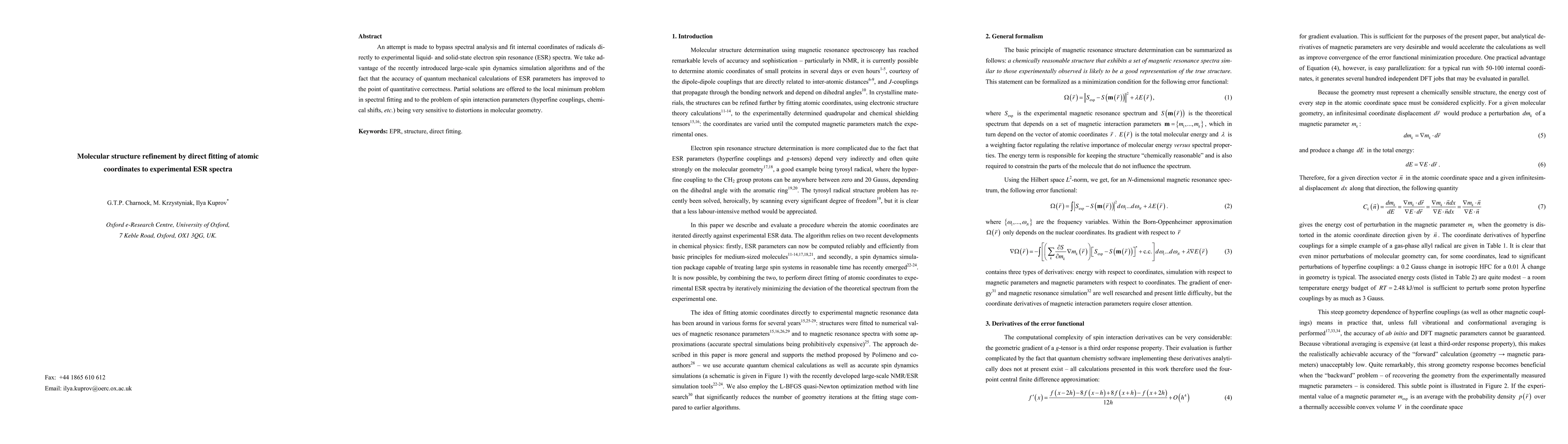 An attempt is made to bypass spectral analysis and fit internal coordinates of radicals directly to experimental liquid- and solid-state electron spin resonance (ESR) spectra. We take advantage of the recently introduced large-scale spin dynamics simulation algorithms and of the fact that the accuracy of quantum mechanical calculations of ESR parameters has improved to the point of quantitative correctness. Partial solutions are offered to the local minimum problem in spectral fitting and to the problem of spin interaction parameters (hyperfine couplings, chemical shifts, etc.) being very sensitive to distortions in molecular geometry.