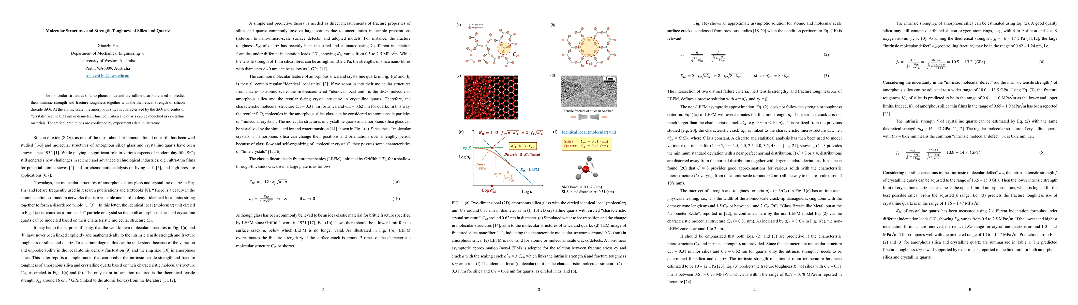 This research investigates the molecular structures of amorphous silica and crystalline quartz to predict their intrinsic strength and fracture toughness, finding both materials can be modeled as crystalline, with predictions confirmed by experimental data.