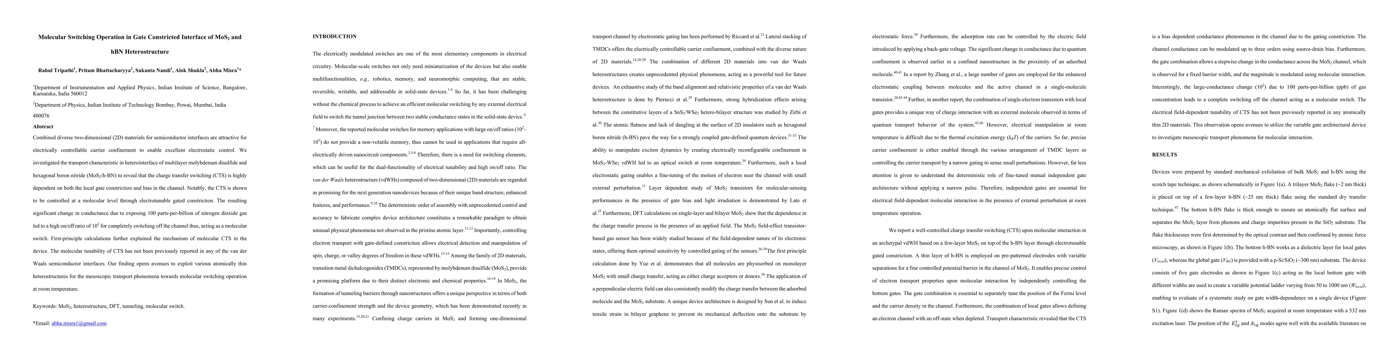 Combined diverse two-dimensional (2D) materials for semiconductor interfaces are attractive for electrically controllable carrier confinement to enable excellent electrostatic control. We investigated the transport characteristic in heterointerface of multilayer molybdenum disulfide and hexagonal boron nitride (MoS$_2$/h-BN) to reveal that the charge transfer switching (CTS) is highly dependent on both the local gate constriction and bias in the channel. Notably, the CTS is shown to be controlled at a molecular level through electrotunable gated constriction. The resulting significant change in conductance due to exposing 100 parts-per-billion of nitrogen dioxide gas led to a high on/off ratio of 10 2 for completely switching off the channel thus, acting as a molecular switch. First-principle calculations further explained the mechanism of molecular CTS in the device. The molecular tunability of CTS has not been previously reported in any of the van der Waals semiconductor interfaces. Our finding opens avenues to exploit various atomically thin heterostructures for the mesoscopic transport phenomena towards molecular switching operation at room temperature.