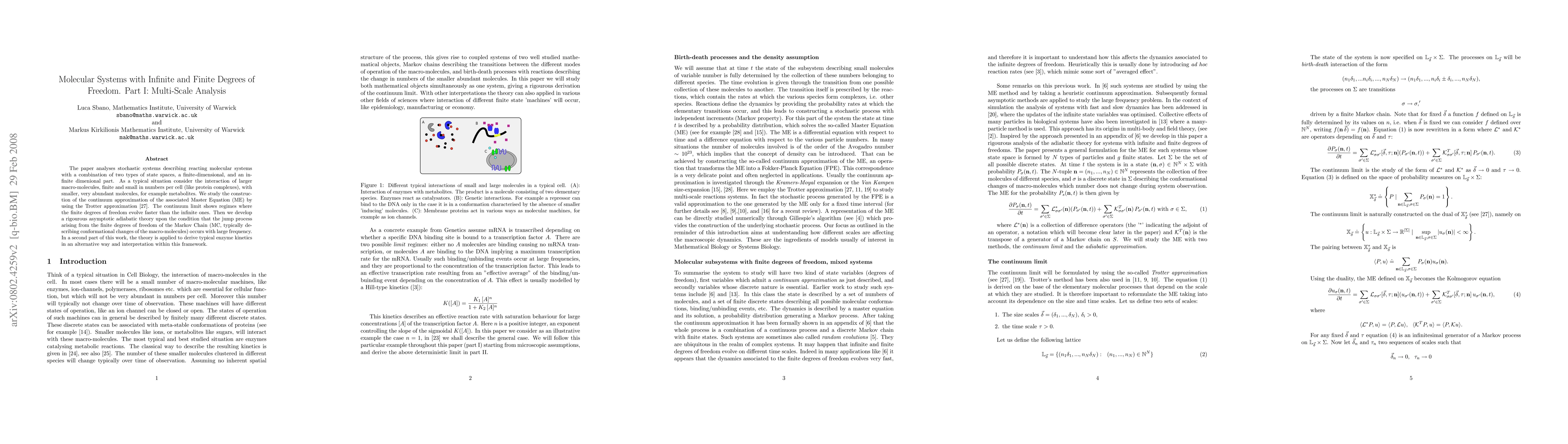 The paper analyses stochastic systems describing reacting molecular systems with a combination of two types of state spaces, a finite-dimensional, and an infinite dimenional part. As a typical situation consider the interaction of larger macro-molecules, finite and small in numbers per cell (like protein complexes), with smaller, very abundant molecules, for example metabolites. We study the construction of the continuum approximation of the associated Master Equation (ME) by using the Trotter approximation [27]. The continuum limit shows regimes where the finite degrees of freedom evolve faster than the infinite ones. Then we develop a rigourous asymptotic adiabatic theory upon the condition that the jump process arising from the finite degrees of freedom of the Markov Chain (MC, typically describing conformational changes of the macro-molecules) occurs with large frequency. In a second part of this work, the theory is applied to derive typical enzyme kinetics in an alternative way and interpretation within this framework.