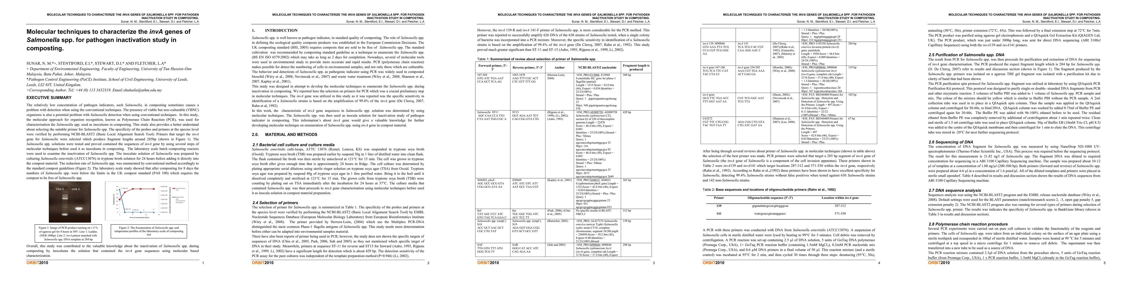 The relatively low concentration of pathogen indicators, such Salmonella, in composting sometimes causes a problem with detection when using the conventional techniques. The presence of viable but non-culturable (VBNC) organisms is also a potential problem with Salmonella detection when using conventional techniques. In this study, the molecular approach for organism recognition, known as Polymerase Chain Reaction (PCR), was used for characterisation the Salmonella spp. used as inoculums in composting. This study also provides a better understand about selecting the suitable primer for Salmonella spp. The specificity of the probes and primers at the species level were verified by performing NCBI-BLAST2 (Basic Local Alignment Search Tool). Primers that target the invA gene for Salmonella were selected which produce fragment lengths around 285bp (shown in Figure 1). The Salmonella spp. solutions were tested and proved contained the sequences of invA gene by using several steps of molecular techniques before used it as inoculums in composting. The laboratory scale batch composting reactors were used to examine the inactivation of Salmonella spp. The inoculate solution of Salmonella was prepared by culturing Salmonella enteritidis (ATCC13076) in tryptone broth solution for 24 hours before adding it directly into the compost material. The reduction rate of Salmonella spp. was enumerated by conventional method accordingly to the standard compost guidelines (Figure 2). The laboratory scale study showed that after composting for 8 days the numbers of Salmonella spp. were below the limits in the UK compost standard (PAS 100) which requires the compost to be free of Salmonella spp.