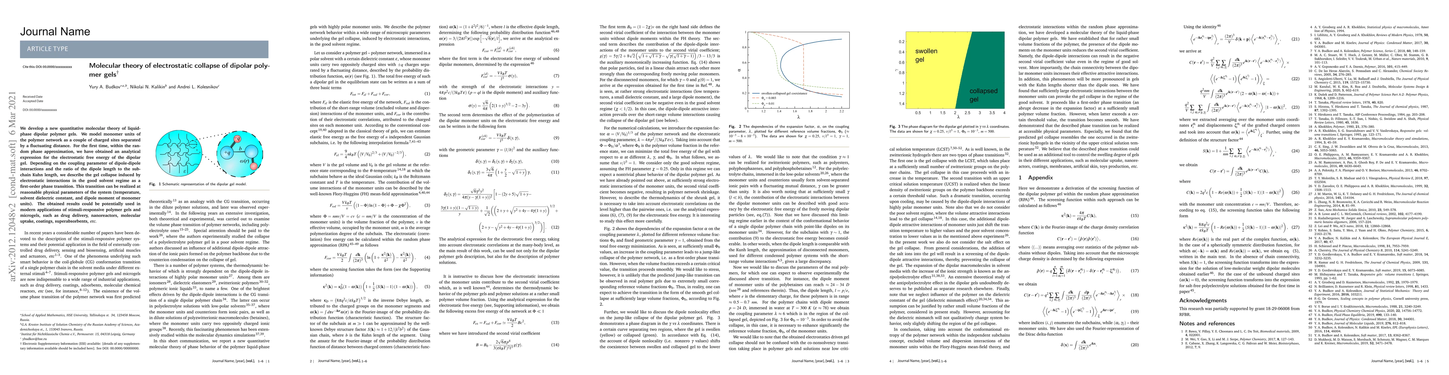 This paper presents a new molecular theory for dipolar polymer gels, modeling monomer units as charged sites with fluctuating distances. It provides an analytical expression for the electrostatic free energy and describes the gel collapse induced by electrostatic interactions as a first-order phase transition, with potential applications in stimuli-responsive polymer technologies.