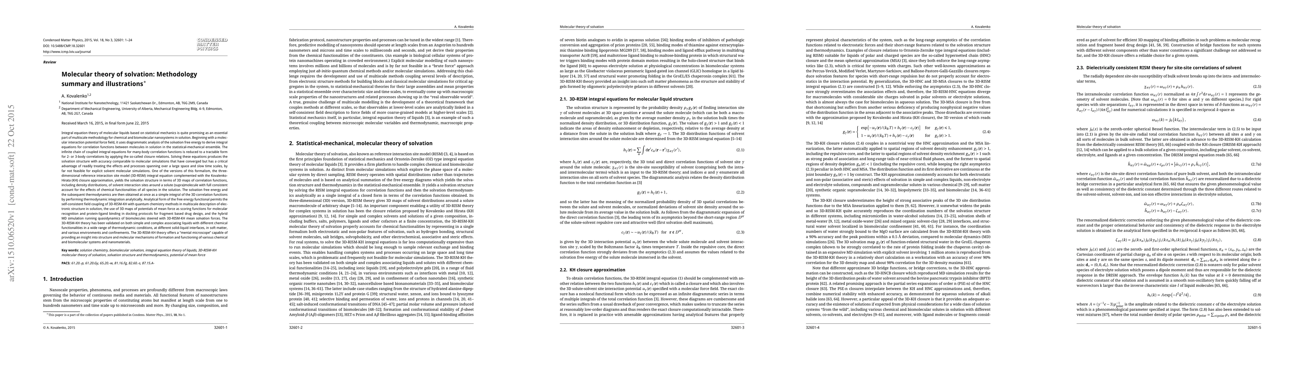 Integral equation theory of molecular liquids based on statistical mechanics is quite promising as an essential part of multiscale methodology for chemical and biomolecular nanosystems in solution. Beginning with a molecular interaction potential force field, it uses diagrammatic analysis of the solvation free energy to derive integral equations for correlation functions between molecules in solution in the statistical-mechanical ensemble. The infinite chain of coupled integral equations for many-body correlation functions is reduced to a tractable form for 2- or 3-body correlations by applying the so-called closure relations. Solving these equations produces the solvation structure with accuracy comparable to molecular simulations that have converged but has a critical advantage of readily treating the effects and processes spanning over a large space and slow time scales, by far not feasible for explicit solvent molecular simulations. One of the versions of this formalism, the three-dimensional reference interaction site model (3D-RISM) integral equation complemented with the Kovalenko-Hirata (KH) closure approximation, yields the solvation structure in terms of 3D maps of correlation functions, including density distributions, of solvent interaction sites around a solute (supra)molecule with full consistent account for the effects of chemical functionalities of all species in the solution. The solvation free energy and the subsequent thermodynamics are then obtained at once as a simple integral of the 3D correlation functions by performing thermodynamic integration analytically.