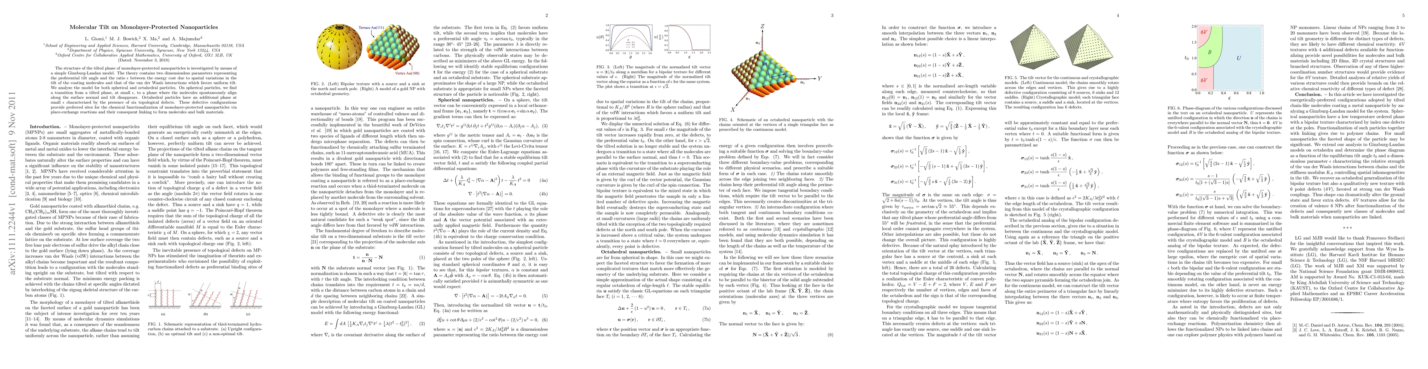 The structure of the tilted phase of monolayer-protected nanoparticles is investigated by means of a simple Ginzburg-Landau model. The theory contains two dimensionless parameters representing the preferential tilt angle and the ratio epsilon between the energy cost due to spatial variations in the tilt of the coating molecules and that of the van der Waals interactions which favors uniform tilt. We analyze the model for both spherical and octahedral particles. On spherical particles, we find a transition from a tilted phase, at small epsilon, to a phase where the molecules spontaneously align along the surface normal and tilt disappears. Octahedral particles have an additional phase at small epsilon characterized by the presence of six topological defects. These defective configurations provide preferred sites for the chemical functionalization of monolayer-protected nanoparticles via place-exchange reactions and their consequent linking to form molecules and bulk materials.