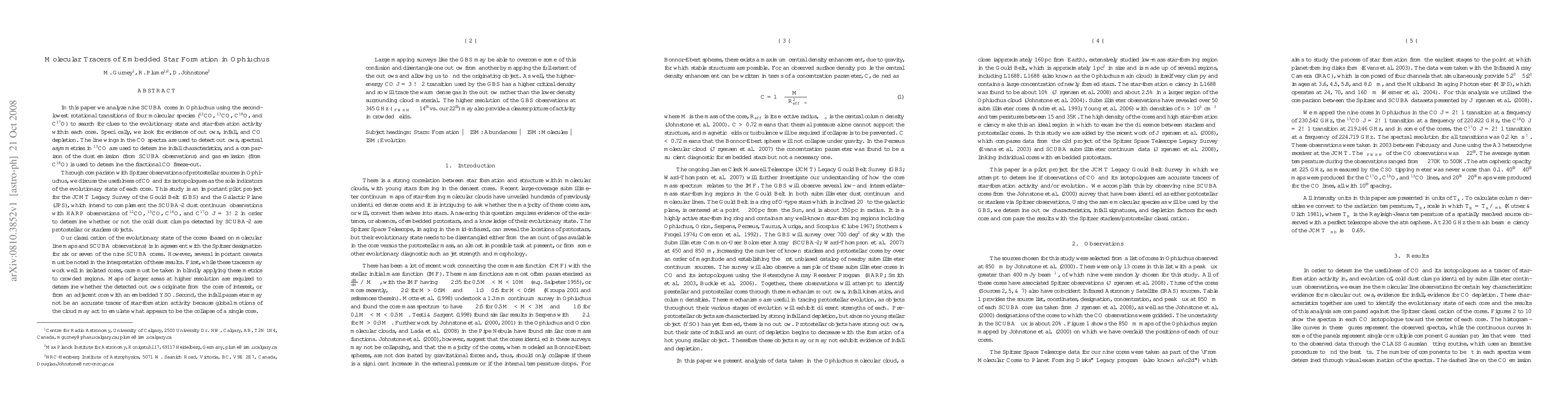 In this paper we analyze nine SCUBA cores in Ophiuchus using the second-lowest rotational transitions of four molecular species (12CO, 13CO, C18O, and C17O) to search for clues to the evolutionary state and star-formation activity within each core. Specifically, we look for evidence of outflows, infall, and CO depletion. The line wings in the CO spectra are used to detect outflows, spectral asymmetries in 13CO are used to determine infall characteristics, and a comparison of the dust emission (from SCUBA observations) and gas emission (from C18O) is used to determine the fractional CO freeze-out. Through comparison with Spitzer observations of protostellar sources in Ophiuchus, we discuss the usefulness of CO and its isotopologues as the sole indicators of the evolutionary state of each core. This study is an important pilot project for the JCMT Legacy Survey of the Gould Belt (GBS) and the Galactic Plane (JPS), which intend to complement the SCUBA-2 dust continuum observations with HARP observations of 12CO, 13CO, C18O, and C17O J = 3 - 2 in order to determine whether or not the cold dust clumps detected by SCUBA-2 are protostellar or starless objects. Our classification of the evolutionary state of the cores (based on molecular line maps and SCUBA observations) is in agreement with the Spitzer designation for six or seven of the nine SCUBA cores. However, several important caveats exist in the interpretation of these results, many of which large mapping surveys like the GBS may be able to overcome to provide a clearer picture of activity in crowded fields.