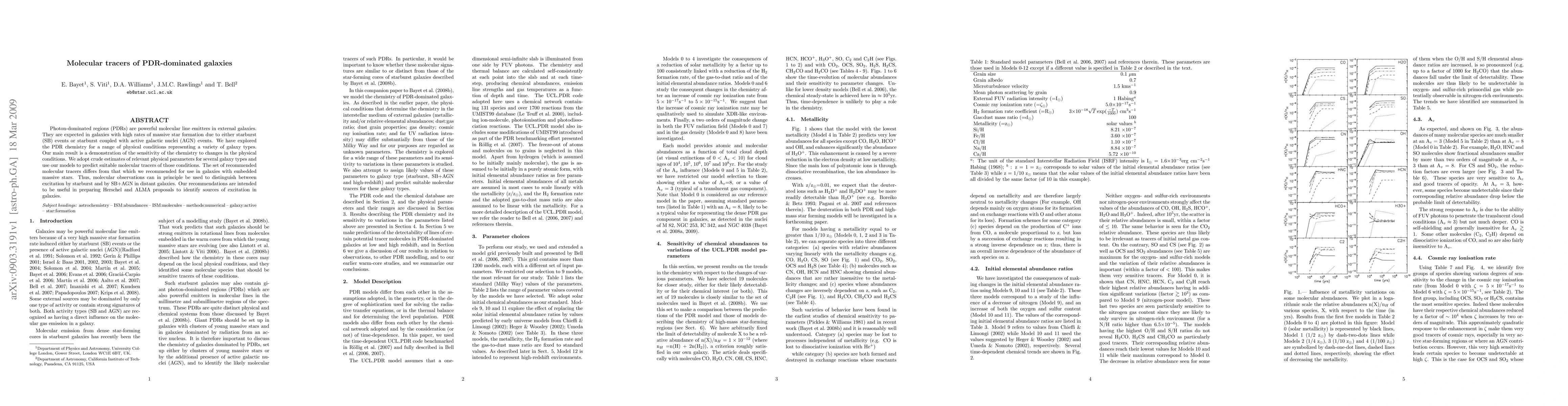 This paper investigates the molecular tracers of photon-dominated regions (PDRs) in galaxies, demonstrating how PDR chemistry varies with different physical conditions and recommending specific molecular tracers for starburst and starburst-active galactic nucleus (SB+AGN) events. The findings aim to help in distinguishing between these excitation sources in distant galaxies and guide future Herschel and ALMA proposals.