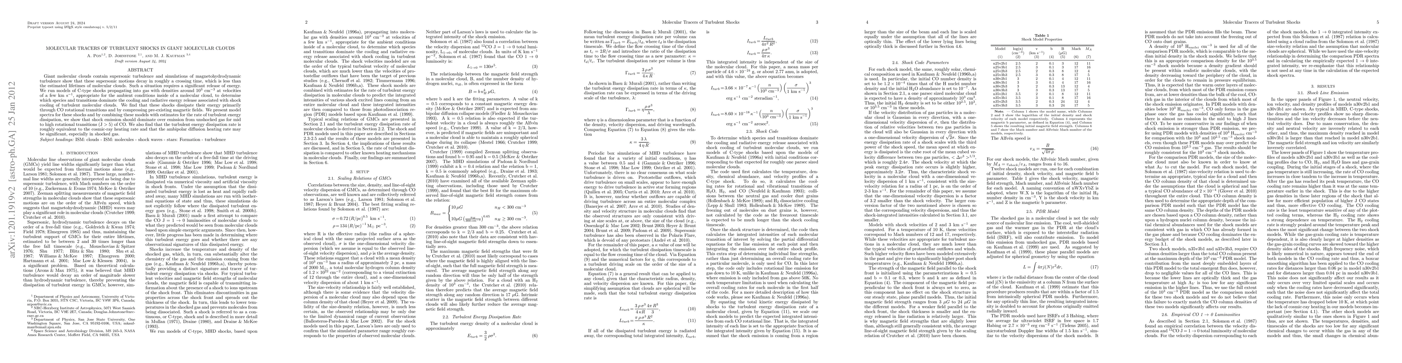This paper investigates the molecular tracers of turbulent shocks in giant molecular clouds, finding that C-type shocks primarily dissipate energy via CO rotational transitions and magnetic field compression. The study concludes that shock emission dominates over unshocked gas for high rotational transitions of CO.