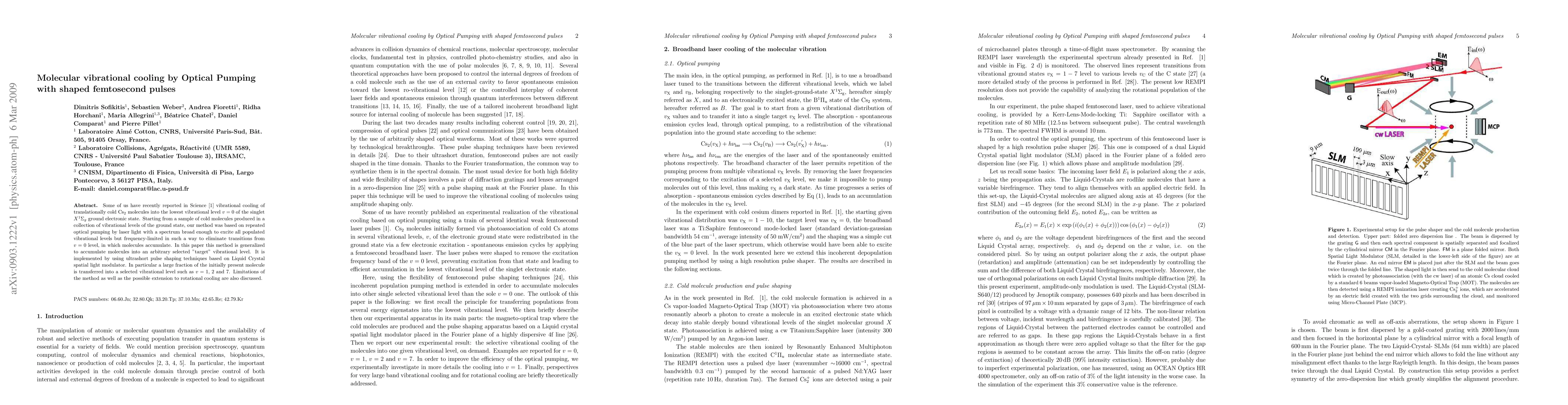 Some of us have recently reported in Science 321 232 (2008) vibrational cooling of translationally cold Cs_2 molecules into the lowest vibrational level v=0 of the singlet X 1Sigma_g ground electronic state. Starting from a sample of cold molecules produced in a collection of vibrational levels of the ground state, our method was based on repeated optical pumping by laser light with a spectrum broad enough to excite all populated vibrational levels but frequency-limited in such a way to eliminate transitions from v=0 level, in which molecules accumulate. In this paper this method is generalized to accumulate molecules into an arbitrary selected "target" vibrational level. It is implemented by using ultrashort pulse shaping techniques based on Liquid Crystal spatial light modulator. In particular a large fraction of the initially present molecule is transferred into a selected vibrational level such as v=1, 2 and 7. Limitations of the method as well as the possible extension to rotational cooling are also discussed.