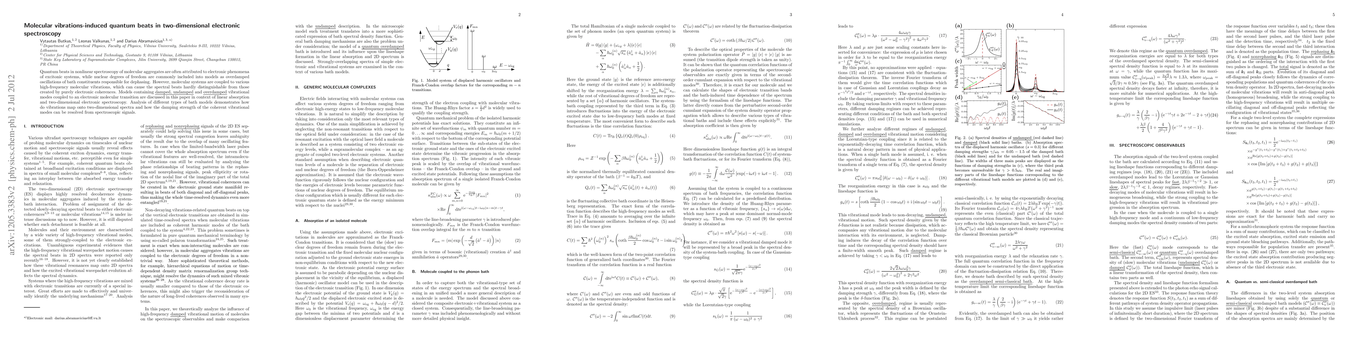 This paper explores how molecular vibrations influence quantum beats in two-dimensional electronic spectroscopy, demonstrating that high-frequency vibrations can create spectral beats similar to electronic coherences. The study analyzes various bath models to show how vibrational modes map onto two-dimensional spectra and how damping strength of these modes can be discerned from spectroscopic signals.
