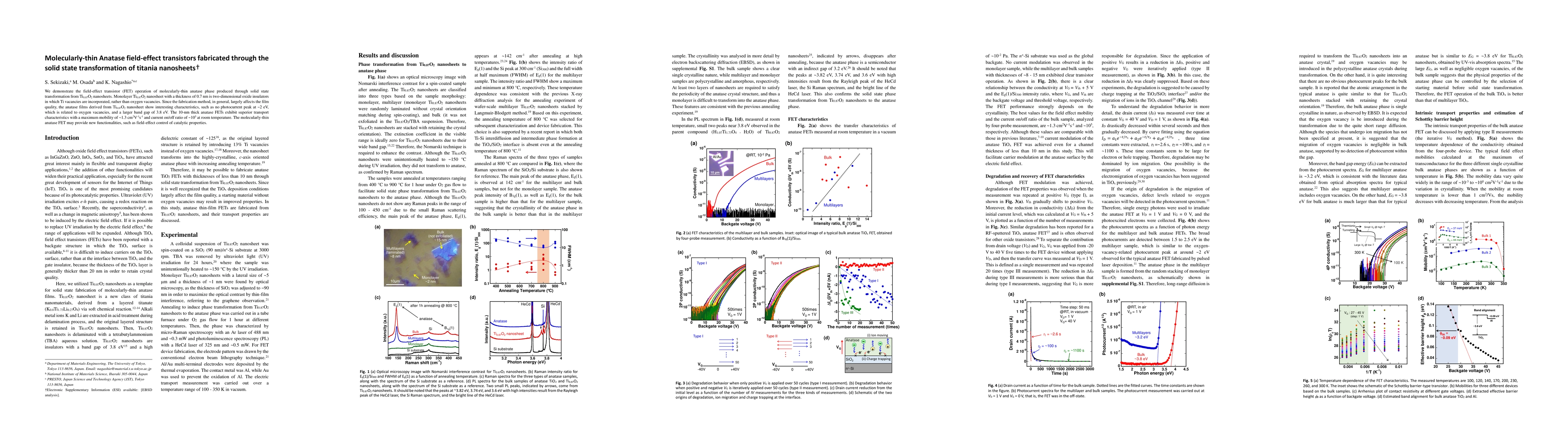 This paper demonstrates the fabrication of molecularly-thin anatase field-effect transistors via solid-state transformation of Ti0.87O2 nanosheets, showing superior transport properties and a band gap of 3.8 eV, with potential for field-effect control of catalytic properties.