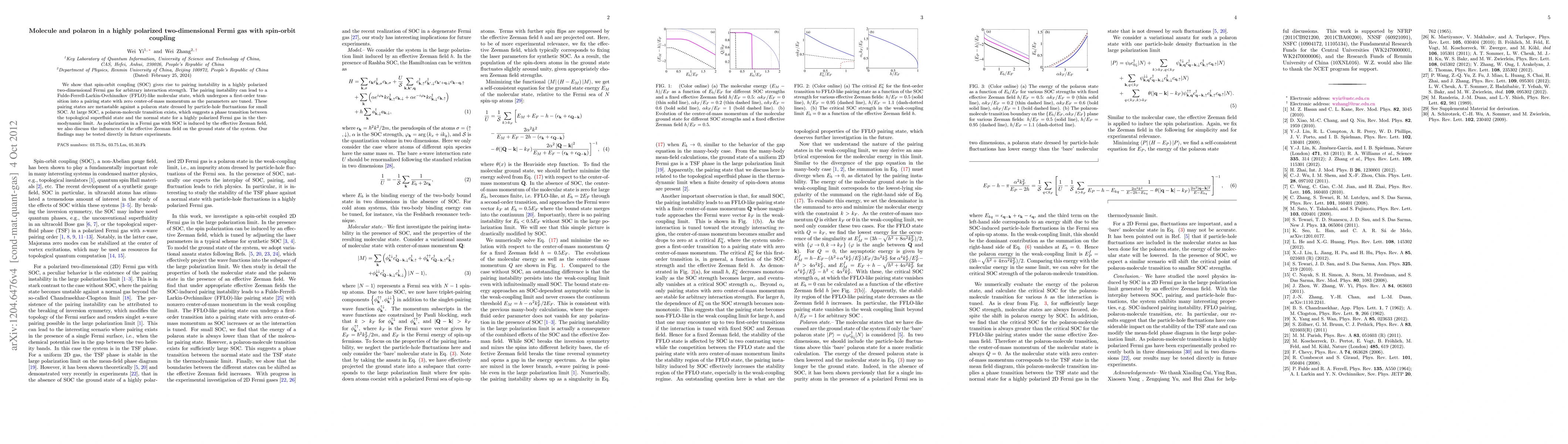This paper explores the effects of spin-orbit coupling on pairing instability in a highly polarized two-dimensional Fermi gas, revealing the emergence of a Fulde-Ferrell-Larkin-Ovchinnikov-like molecular state transitioning to a zero-momentum pairing state. The study also identifies a polaron-molecule phase transition, suggesting a topological superfluid to normal state transition.