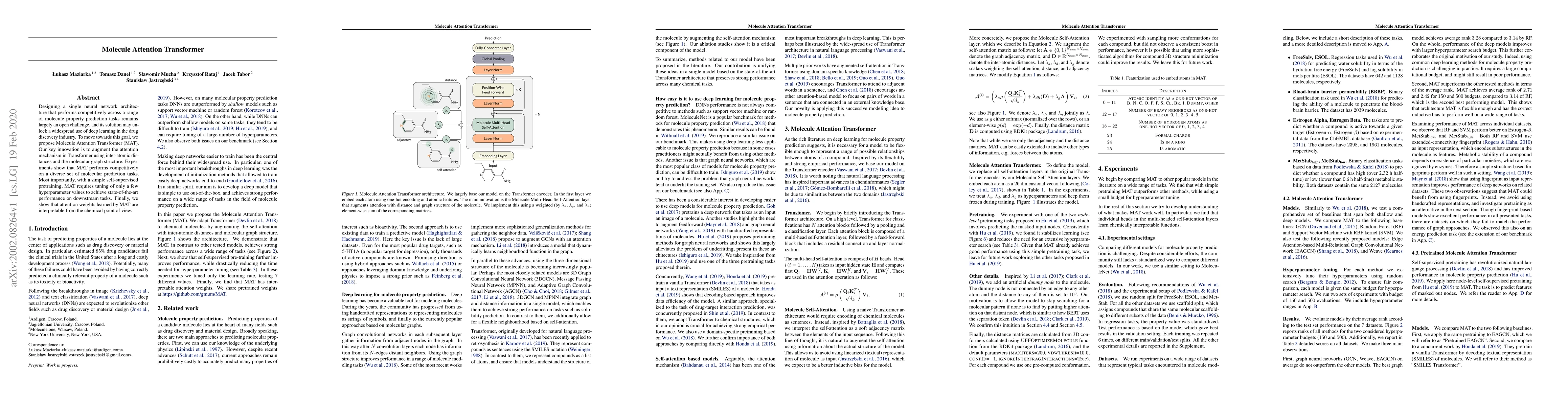 The Molecule Attention Transformer (MAT) proposes an innovative augmentation of the Transformer's attention mechanism using inter-atomic distances and molecular graph structure, achieving competitive performance on various molecule property prediction tasks. With minimal hyperparameter tuning and self-supervised pretraining, MAT demonstrates state-of-the-art results and offers interpretable attention weights from a chemical perspective.