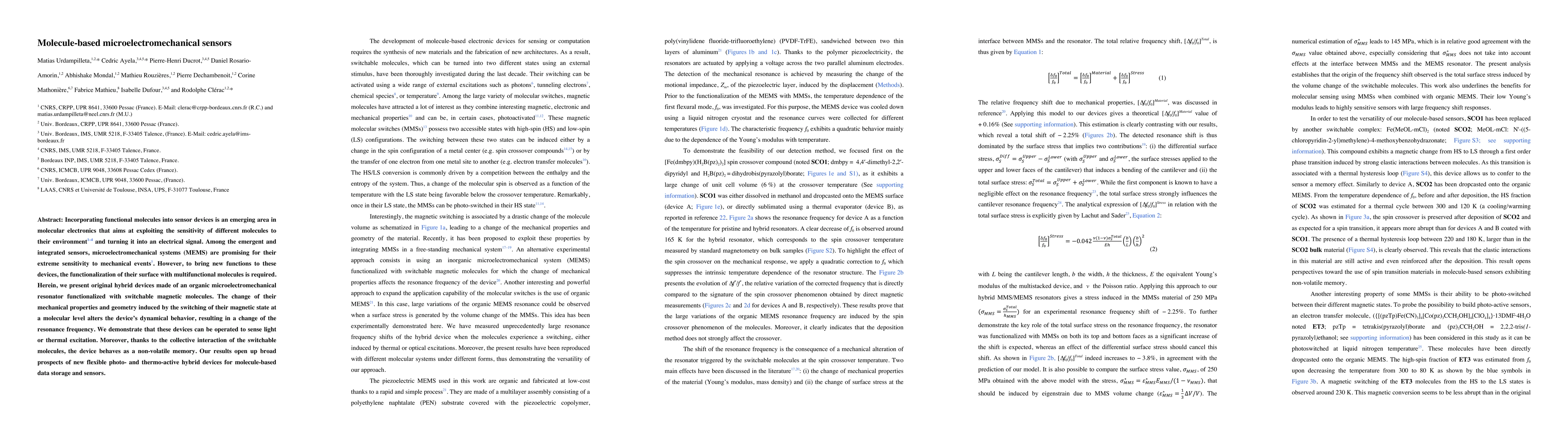 This paper explores the integration of functional molecules into microelectromechanical sensors, specifically polymer resonators functionalized with switchable magnetic molecules. The study demonstrates that these hybrid devices can sense light or thermal changes and function as nonvolatile memory due to collective molecular interactions.