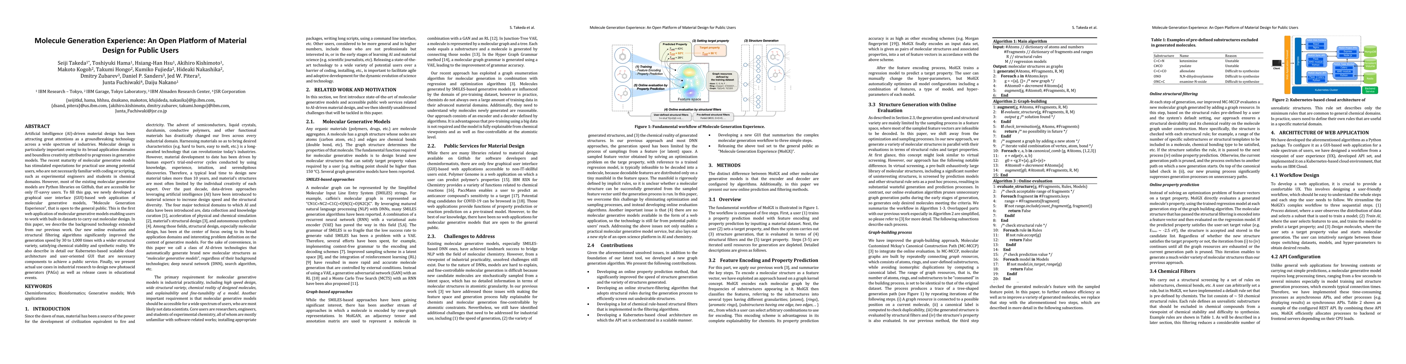 Artificial Intelligence (AI)-driven material design has been attracting great attentions as a groundbreaking technology across a wide spectrum of industries. Molecular design is particularly important owing to its broad application domains and boundless creativity attributed to progresses in generative models. The recent maturity of molecular generative models has stimulated expectations for practical use among potential users, who are not necessarily familiar with coding or scripting, such as experimental engineers and students in chemical domains. However, most of the existing molecular generative models are Python libraries on GitHub, that are accessible for only IT-savvy users. To fill this gap, we newly developed a graphical user interface (GUI)-based web application of molecular generative models, Molecule Generation Experience, that is open to the general public. This is the first web application of molecular generative models enabling users to work with built-in datasets to carry out molecular design. In this paper, we describe the background technology extended from our previous work. Our new online evaluation and structural filtering algorithms significantly improved the generation speed by 30 to 1,000 times with a wider structural variety, satisfying chemical stability and synthetic reality. We also describe in detail our Kubernetes-based scalable cloud architecture and user-oriented GUI that are necessary components to achieve a public service. Finally, we present actual use cases in industrial research to design new photoacid generators (PAGs) as well as release cases in educational events.