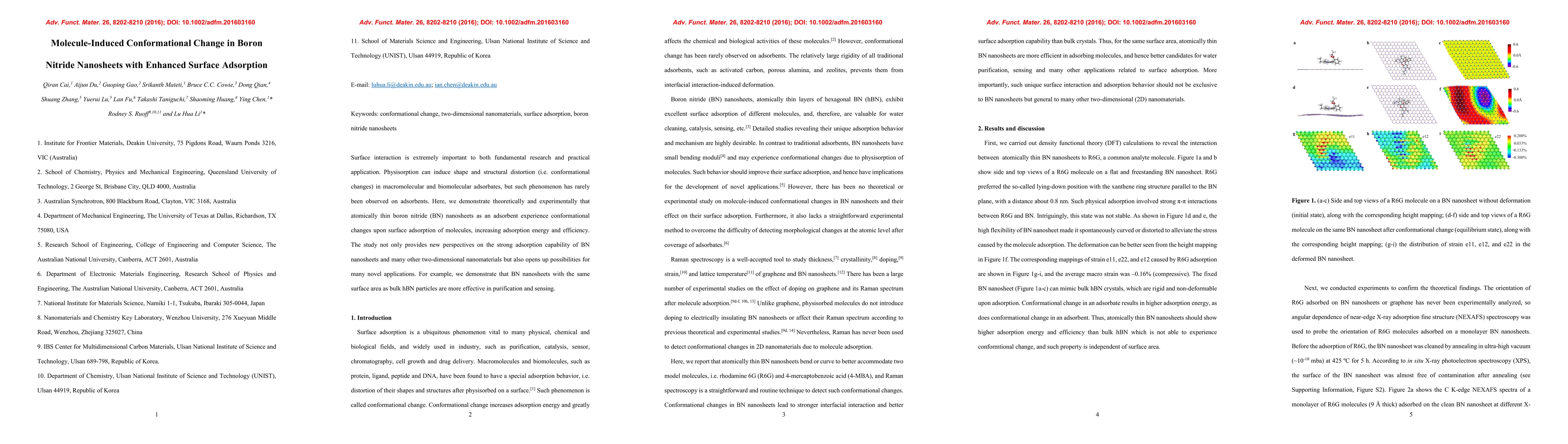This research reveals that atomically thin boron nitride nanosheets undergo conformational changes upon molecular adsorption, enhancing surface adsorption efficiency. This discovery provides new insights into the strong adsorption properties of BN nanosheets and opens potential applications in purification and sensing.