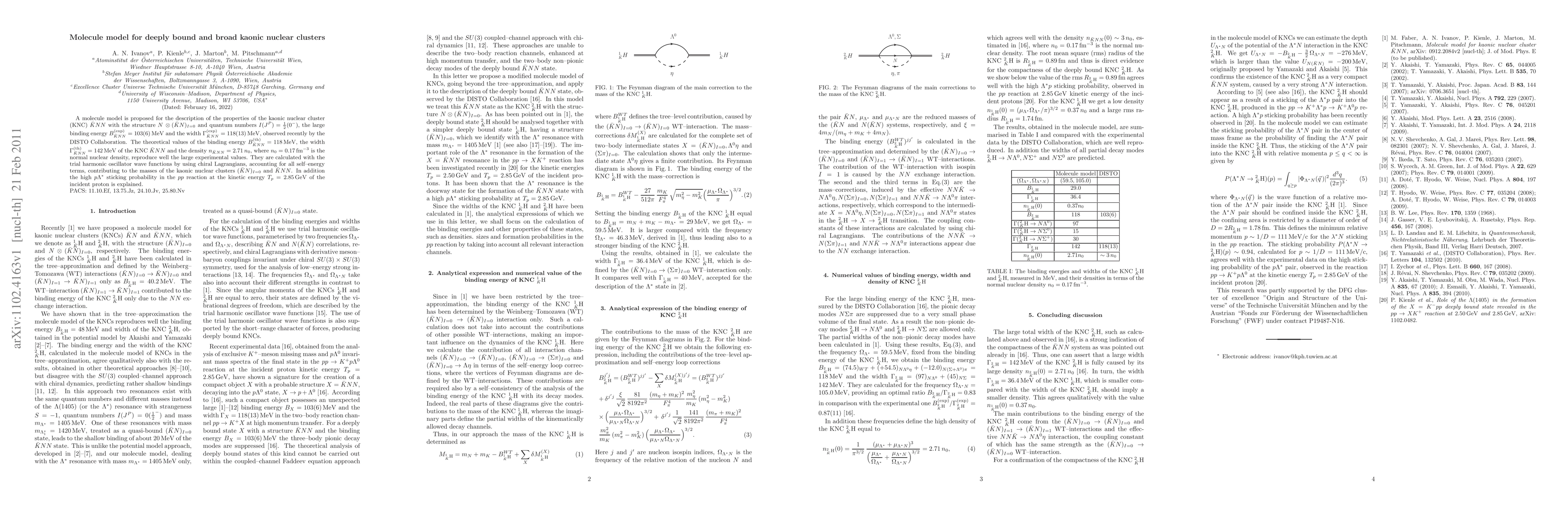 The paper proposes a molecule model to describe the properties of the kaonic nuclear cluster (KNC) anti-KNN, matching theoretical calculations with experimental observations of large binding energy and width. The model accurately reproduces experimental values using chiral Lagrangians and trial harmonic oscillator wave functions.