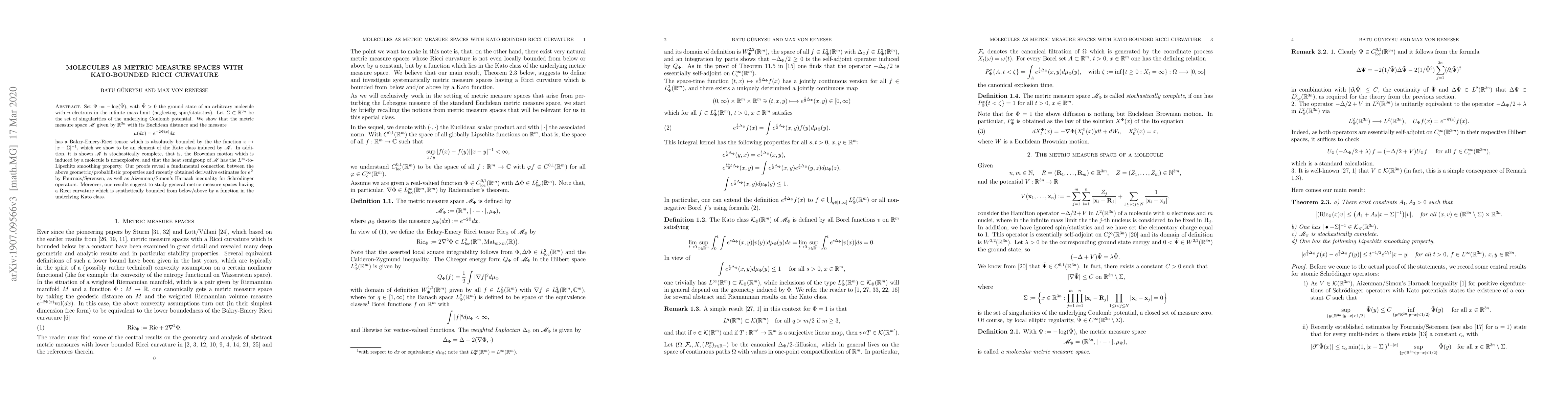 Set $\Psi:=-\log(\tilde{\Psi})$, with $\tilde{\Psi}>0$ the ground state of an arbitrary molecule with $n$ electrons in the infinite mass limit (neglecting spin/statistics). Let $\Sigma\subset \IR^{3n}$ be the set of singularities of the underlying Coulomb potential. We show that the metric measure space $\IMM$ given by $\IR^{3n}$ with its Euclidean distance and the measure $$ \mu(dx)=e^{-2\Psi(x)}dx $$ has a Bakry-Emery-Ricci tensor which is absolutely bounded by the the function $x\mapsto |x-\Sigma|^{-1}$, which we show to be an element of the Kato class induced by $\IMM$. In addition, it is shown $\IMM$ is stochastically complete, that is, the Brownian motion which is induced by a molecule is nonexplosive, and that the heat semigroup of $\IMM$ has the $L^{\infty}$-to-Lipschitz smoothing property. Our proofs reveal a fundamental connection between the above geometric/probabilistic properties and recently obtained derivative estimates for $e^{\Psi}$ by Fournais/S\o rensen, as well as Aizenman/Simon's Harnack inequality for Schr\"odinger operators. Moreover, our results suggest to study general metric measure spaces having a Ricci curvature which is synthetically bounded from below/above by a function in the underlying Kato class.