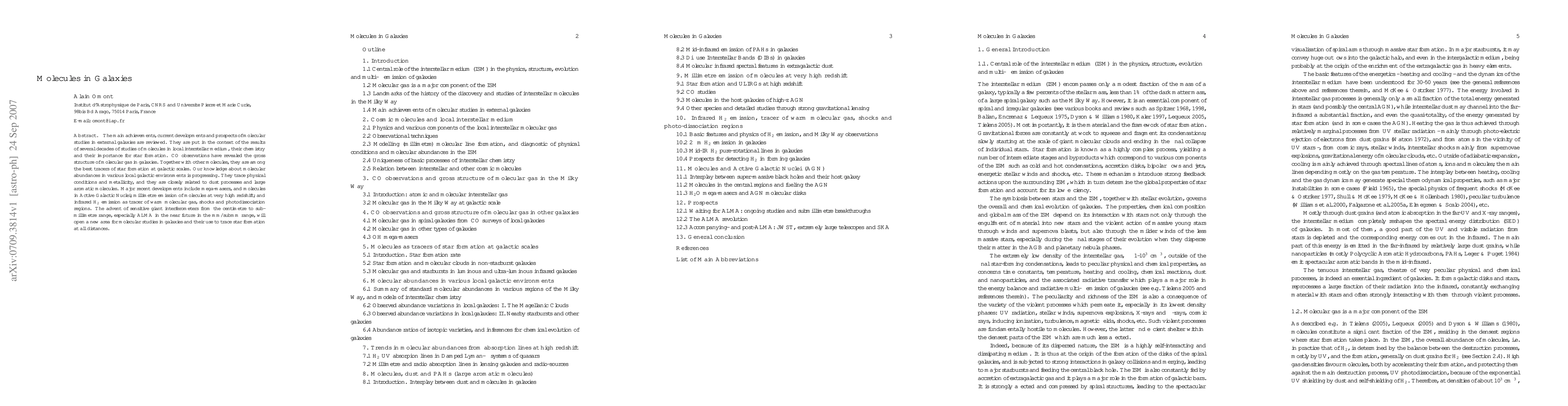 The main achievements, current developments and prospects of molecular studies in external galaxies are reviewed. They are put in the context of the results of several decades of studies of molecules in local interstellar medium, their chemistry and their importance for star formation. CO observations have revealed the gross structure of molecular gas in galaxies. Together with other molecules, they are among the best tracers of star formation at galactic scales. Our knowledge about molecular abundances in various local galactic environments is progressing. They trace physical conditions and metallicity, and they are closely related to dust processes and large aromatic molecules. Major recent developments include mega-masers, and molecules in Active Galactic Nuclei; millimetre emission of molecules at very high redshift; and infrared H2 emission as tracer of warm molecular gas, shocks and photodissociation regions. The advent of sensitive giant interferometers from the centimetre to sub-millimetre range, especially ALMA in the near future in the mm/submm range, will open a new area for molecular studies in galaxies and their use to trace star formation at all distances.
