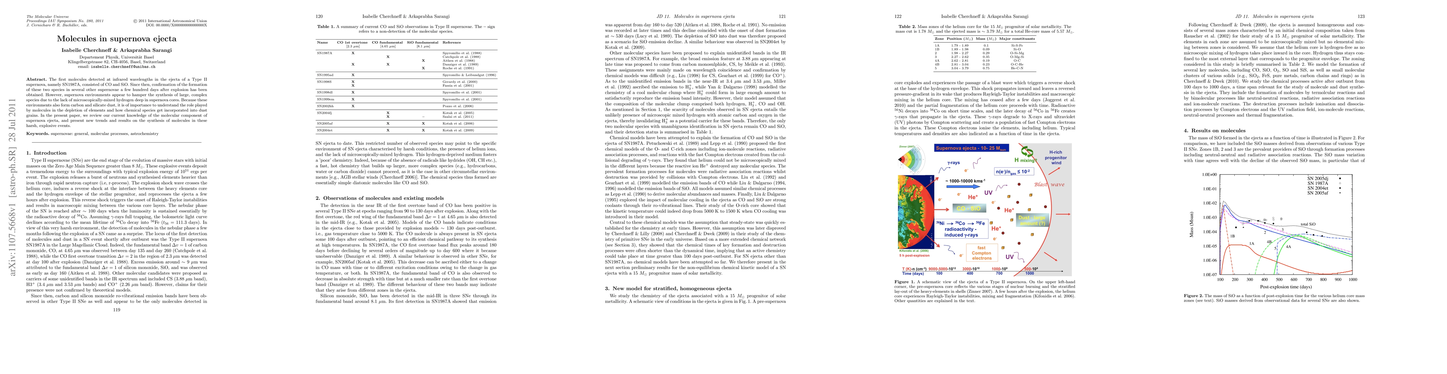 This paper reviews the detection of CO and SiO in the ejecta of Type II supernovae, highlighting the formation of these molecules a few hundred days post-explosion, while noting the difficulty in synthesizing large, complex species due to the supernova environment. It emphasizes the importance of understanding molecular roles in element depletion and dust grain formation.
