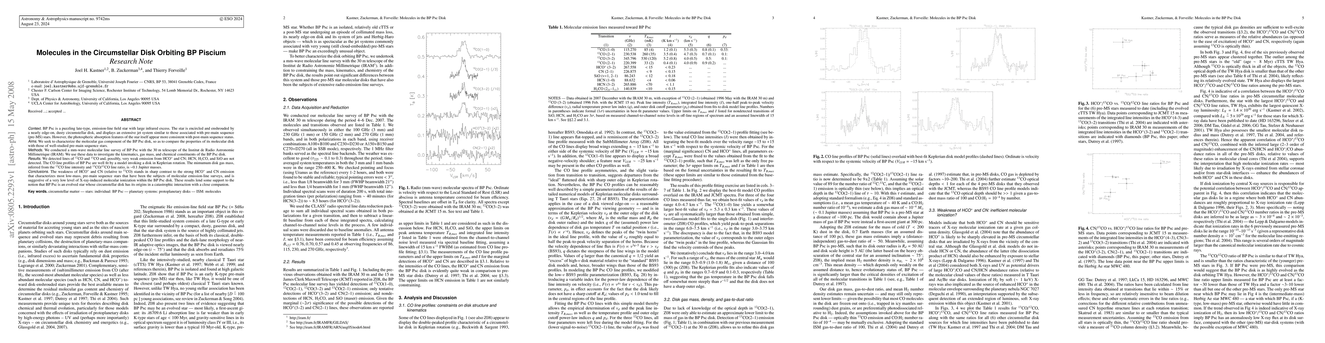 This paper reports a molecular line survey of the star BP Piscium, revealing CO and possibly weak HCO+ and CN emissions, suggesting a low-mass gas disk in Keplerian rotation. The low levels of HCO+ and CN relative to CO imply minimal X-ray-induced ionization, supporting the hypothesis that BP Piscium's disk may result from a past catastrophic interaction with a companion star.