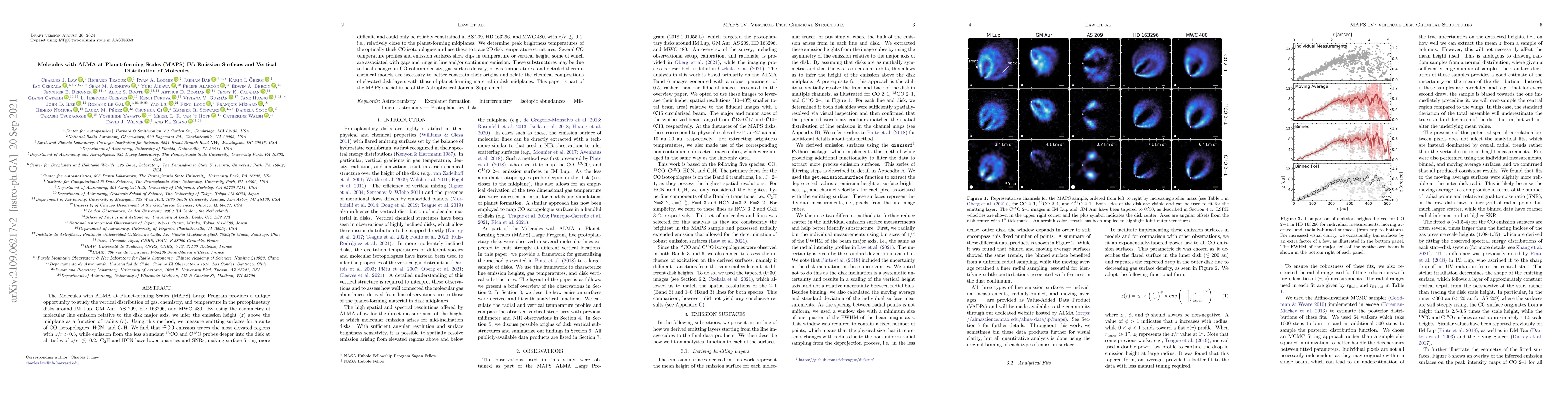 The Molecules with ALMA at Planet-forming Scales (MAPS) Large Program provides a unique opportunity to study the vertical distribution of gas, chemistry, and temperature in the protoplanetary disks around IM Lup, GM Aur, AS 209, HD 163296, and MWC 480. By using the asymmetry of molecular line emission relative to the disk major axis, we infer the emission height ($z$) above the midplane as a function of radius ($r$). Using this method, we measure emitting surfaces for a suite of CO isotopologues, HCN, and C$_2$H. We find that $^{12}$CO emission traces the most elevated regions with $z/r > 0.3$, while emission from the less abundant $^{13}$CO and C$^{18}$O probes deeper into the disk at altitudes of $z/r \lesssim 0.2$. C$_2$H and HCN have lower opacities and SNRs, making surface fitting more difficult, and could only be reliably constrained in AS 209, HD 163296, and MWC 480, with $z/r \lesssim 0.1$, i.e., relatively close to the planet-forming midplanes. We determine peak brightness temperatures of the optically thick CO isotopologues and use these to trace 2D disk temperature structures. Several CO temperature profiles and emission surfaces show dips in temperature or vertical height, some of which are associated with gaps and rings in line and/or continuum emission. These substructures may be due to local changes in CO column density, gas surface density, or gas temperatures, and detailed thermo-chemical models are necessary to better constrain their origins and relate the chemical compositions of elevated disk layers with those of planet-forming material in disk midplanes. This paper is part of the MAPS special issue of the Astrophysical Journal Supplement.