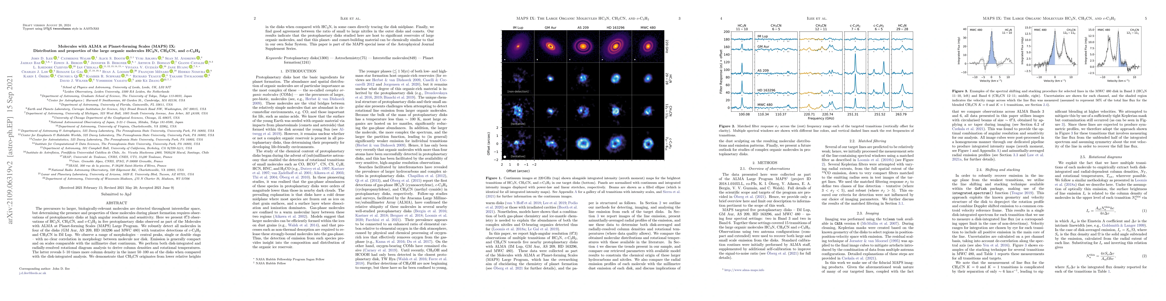 The precursors to larger, biologically-relevant molecules are detected throughout interstellar space, but determining the presence and properties of these molecules during planet formation requires observations of protoplanetary disks at high angular resolution and sensitivity. Here we present 0.3" observations of HC$_3$N, CH$_3$CN, and $c$-C$_3$H$_2$ in five protoplanetary disks observed as part of the Molecules with ALMA at Planet-forming Scales (MAPS) Large Program. We robustly detect all molecules in four of the disks (GM Aur, AS 209, HD 163296 and MWC 480) with tentative detections of $c$-C$_3$H$_2$ and CH$_3$CN in IM Lup. We observe a range of morphologies -- central peaks, single or double rings -- with no clear correlation in morphology between molecule nor disk. Emission is generally compact and on scales comparable with the millimetre dust continuum. We perform both disk-integrated and radially-resolved rotational diagram analysis to derive column densities and rotational temperatures. The latter reveals 5-10 times more column density in the inner 50-100 au of the disks when compared with the disk-integrated analysis. We demonstrate that CH$_3$CN originates from lower relative heights in the disks when compared with HC$_3$N, in some cases directly tracing the disk midplane. Finally, we find good agreement between the ratio of small to large nitriles in the outer disks and comets. Our results indicate that the protoplanetary disks studied here are host to significant reservoirs of large organic molecules, and that this planet- and comet-building material can be chemically similar to that in our own Solar System. This paper is part of the MAPS special issue of the Astrophysical Journal Supplement Series.