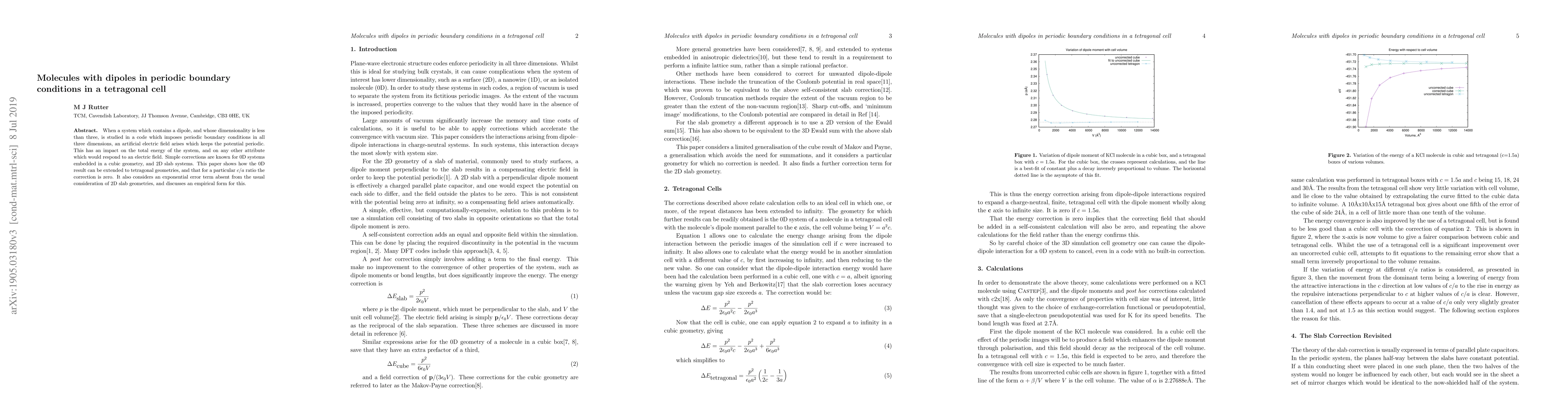 When a system which contains a dipole, and whose dimensionality is less than three, is studied in a code which imposes periodic boundary conditions in all three dimensions, an artificial electric field arises which keeps the potential periodic. This has an impact on the total energy of the system, and on any other attribute which would respond to an electric field. Simple corrections are known for 0D systems embedded in a cubic geometry, and 2D slab systems. This paper shows how the 0D result can be extended to tetragonal geometries, and that for a particular $c/a$ ratio the correction is zero. It also considers an exponential error term absent from the usual consideration of 2D slab geometries, and discusses an empirical form for this.