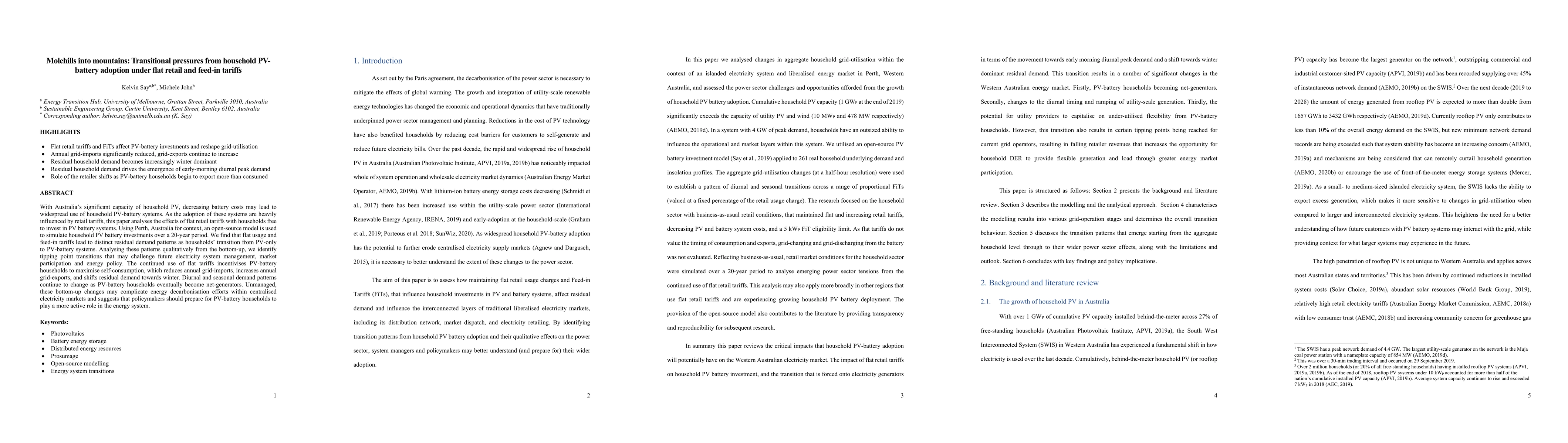 With Australia's significant capacity of household PV, decreasing battery costs may lead to widespread use of household PV-battery systems. As the adoption of these systems are heavily influenced by retail tariffs, this paper analyses the effects of flat retail tariffs with households free to invest in PV battery systems. Using Perth, Australia for context, an open-source model is used to simulate household PV battery investments over a 20-year period. We find that flat usage and feed-in tariffs lead to distinct residual demand patterns as households' transition from PV-only to PV-battery systems. Analysing these patterns qualitatively from the bottom-up, we identify tipping point transitions that may challenge future electricity system management, market participation and energy policy. The continued use of flat tariffs incentivises PV-battery households to maximise self-consumption, which reduces annual grid-imports, increases annual grid-exports, and shifts residual demand towards winter. Diurnal and seasonal demand patterns continue to change as PV-battery households eventually become net-generators. Unmanaged, these bottom-up changes may complicate energy decarbonisation efforts within centralised electricity markets and suggests that policymakers should prepare for PV-battery households to play a more active role in the energy system.