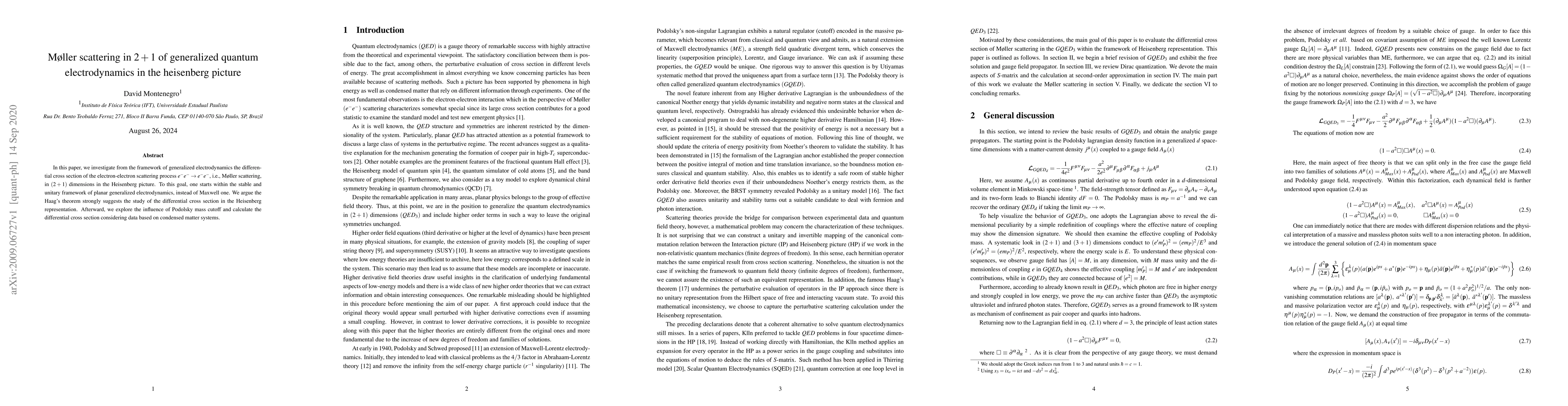 This paper examines M{\o}ller scattering in $(2+1)$ dimensions using generalized quantum electrodynamics in the Heisenberg picture, focusing on the differential cross section of electron-electron scattering. It considers the implications of Haag's theorem and investigates the effect of the Podolsky mass cutoff, drawing on data from condensed matter systems.