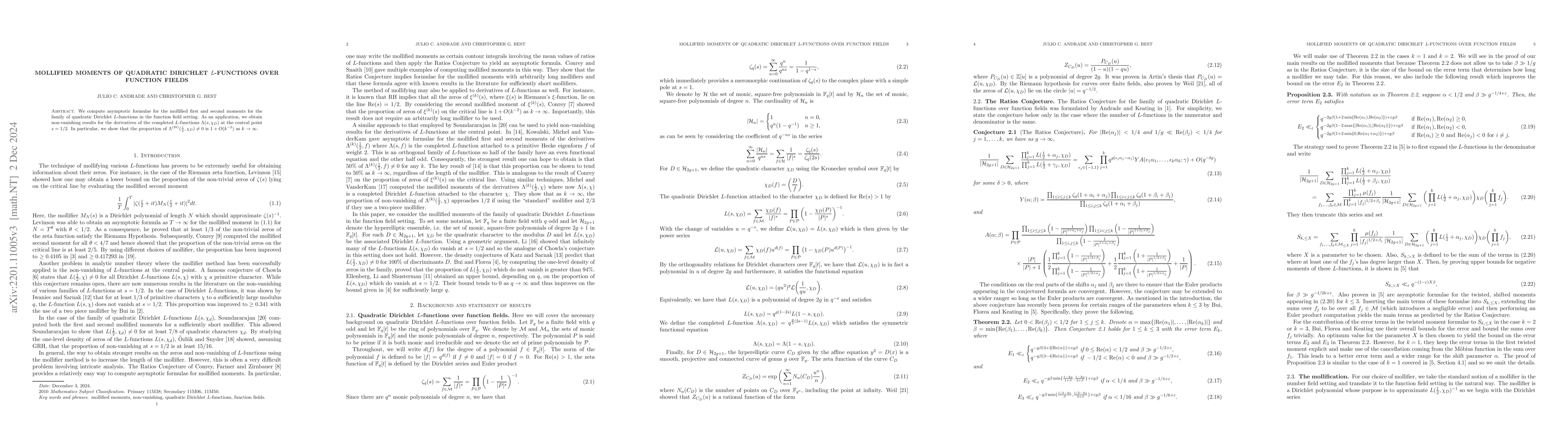 The work is notable for applying recent progress in the Ratios Conjecture to compute mollified moments and for providing a direct application of the Katz-Sarnak density conjecture to establish non-vanishing results for L(1/2, χ_D).