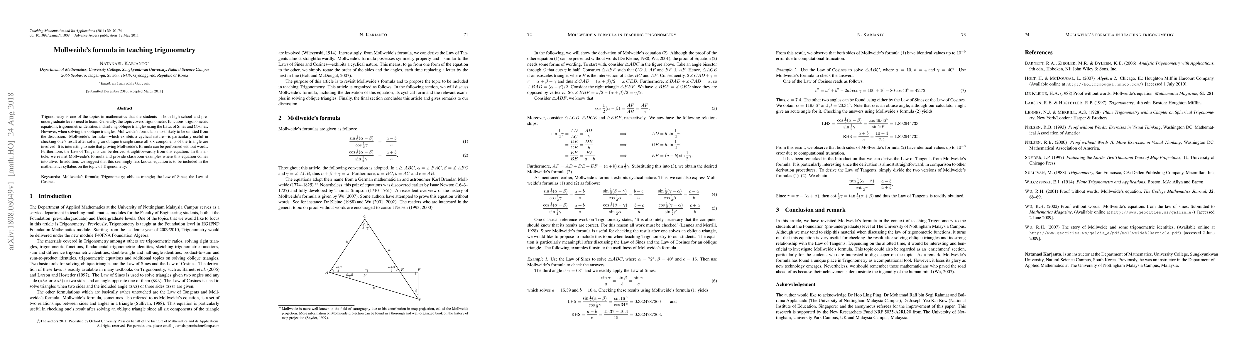 Trigonometry is one of the topics in mathematics that the students in both high school and pre-undergraduate levels need to learn. Generally, the topic covers trigonometric functions, trigonometric equations, trigonometric identities and solving oblique triangles using the Laws of Sines and Cosines. However, when solving the oblique triangles, Mollweide's formula is most likely to be omitted from the discussion. Mollweide's formula--which exhibits a cyclical nature--is particularly useful in checking one's result after solving an oblique triangle since all six components of the triangle are involved. It is interesting to note that proving Mollweide's formula can be performed without words. Furthermore, the Law of Tangents can be derived straightforwardly from this equation. In this article, we revisit Mollweide's formula and provide classroom examples where this equation comes into alive. In addition, we suggest that this seemingly less-known equation is to be included in the mathematics syllabus on the topic of Trigonometry.