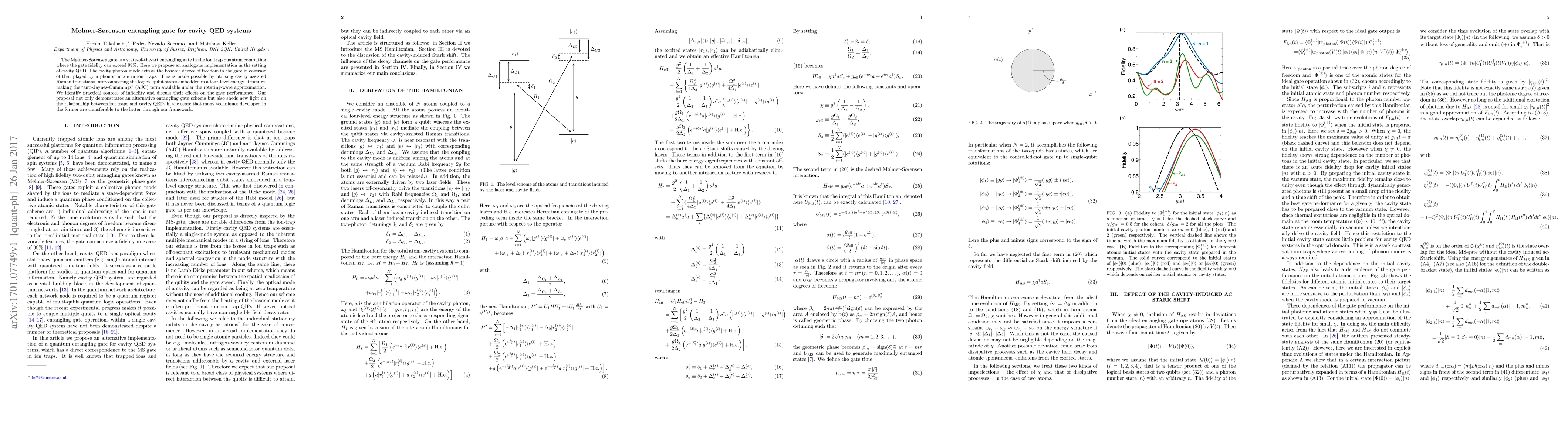 The paper proposes an implementation of the M{\o}lmer-S{\o}rensen entangling gate in cavity QED systems, utilizing cavity photon modes instead of phonon modes in ion traps, and identifies practical sources of infidelity affecting gate performance. This work highlights the transferability of techniques from ion trap quantum computing to cavity QED.