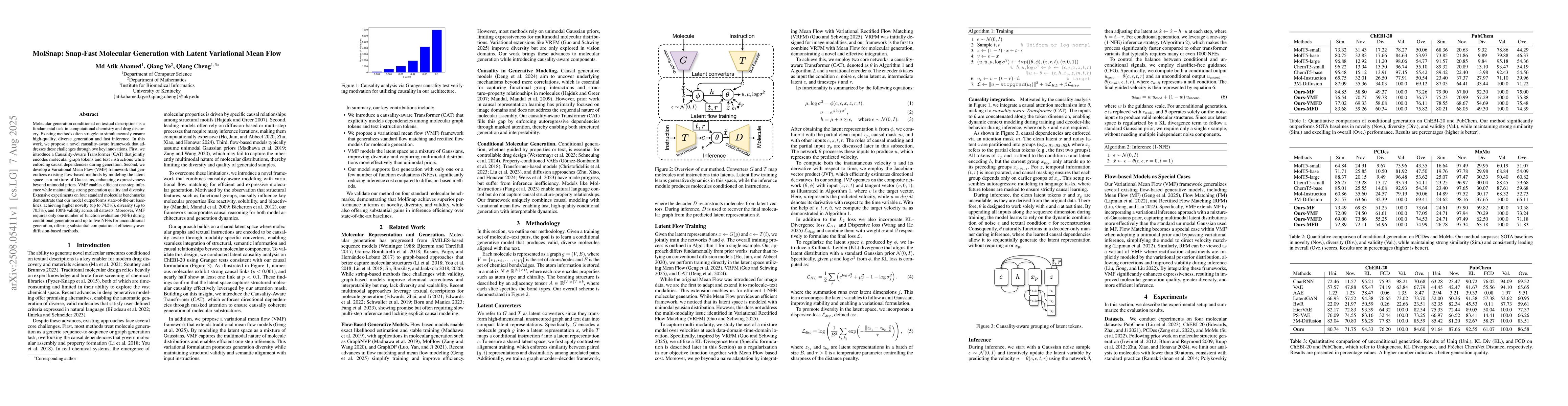 The research introduces MolSnap, a novel framework for molecular generation from text descriptions. It combines a Causality-Aware Transformer (CAT) and a Variational Mean Flow (VMF) to ensure high-quality, diverse generation and fast inference. MolSnap outperforms existing methods on multiple benchmarks, providing superior novelty, diversity, and validity, while being computationally efficient with only one forward pass for conditional generation.